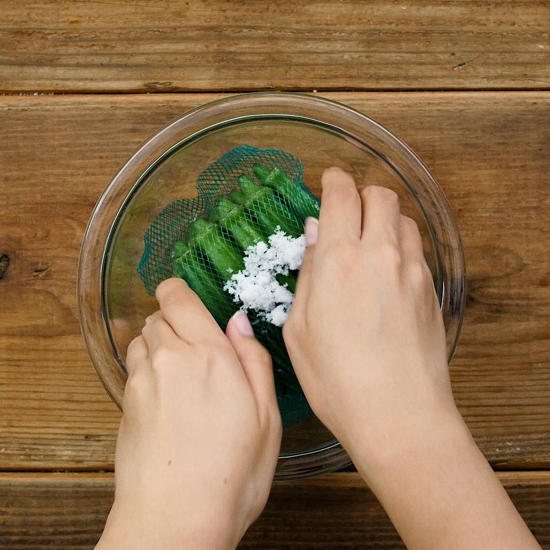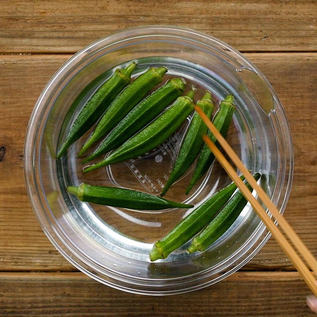 おくらは塩をまぶして板ずりをして、水洗いします。