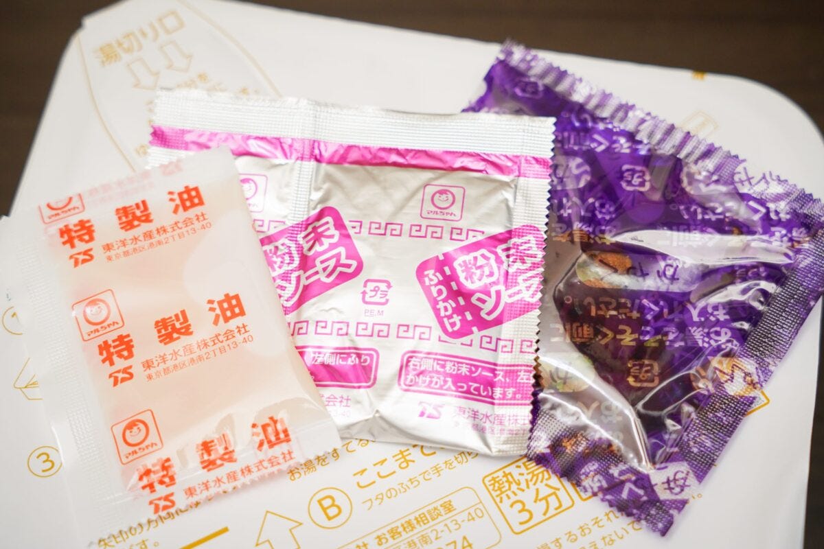 開封すると、麺の他に粉末ソースとふりかけ、かやく、特製油が入っていた。カップ焼きそばといえば液体ソースが主流だと思われるが、粉末ソースは元商品をなるべく再現するためなのだろうか。また、これまた見慣れない特製油もどの様な効果をもたらすのか気になるところだ。