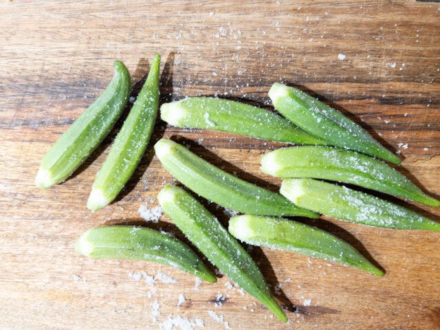 ② オクラに塩をまぶして板摺りし、産毛を取り除きます。