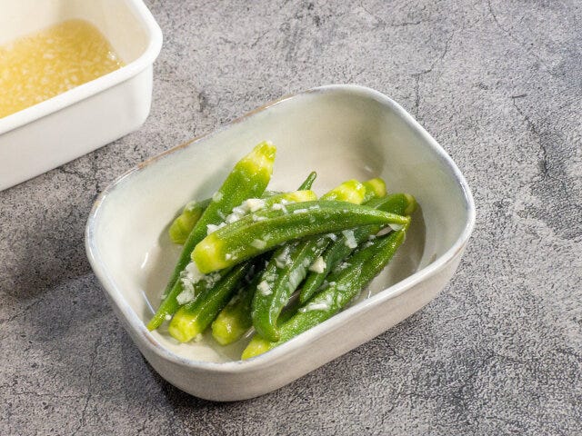 ④ 保存容器に③のオクラを入れ、◎の材料を混ぜ合わせたものを注ぎ、フタをして冷蔵庫で30分以上冷やします。