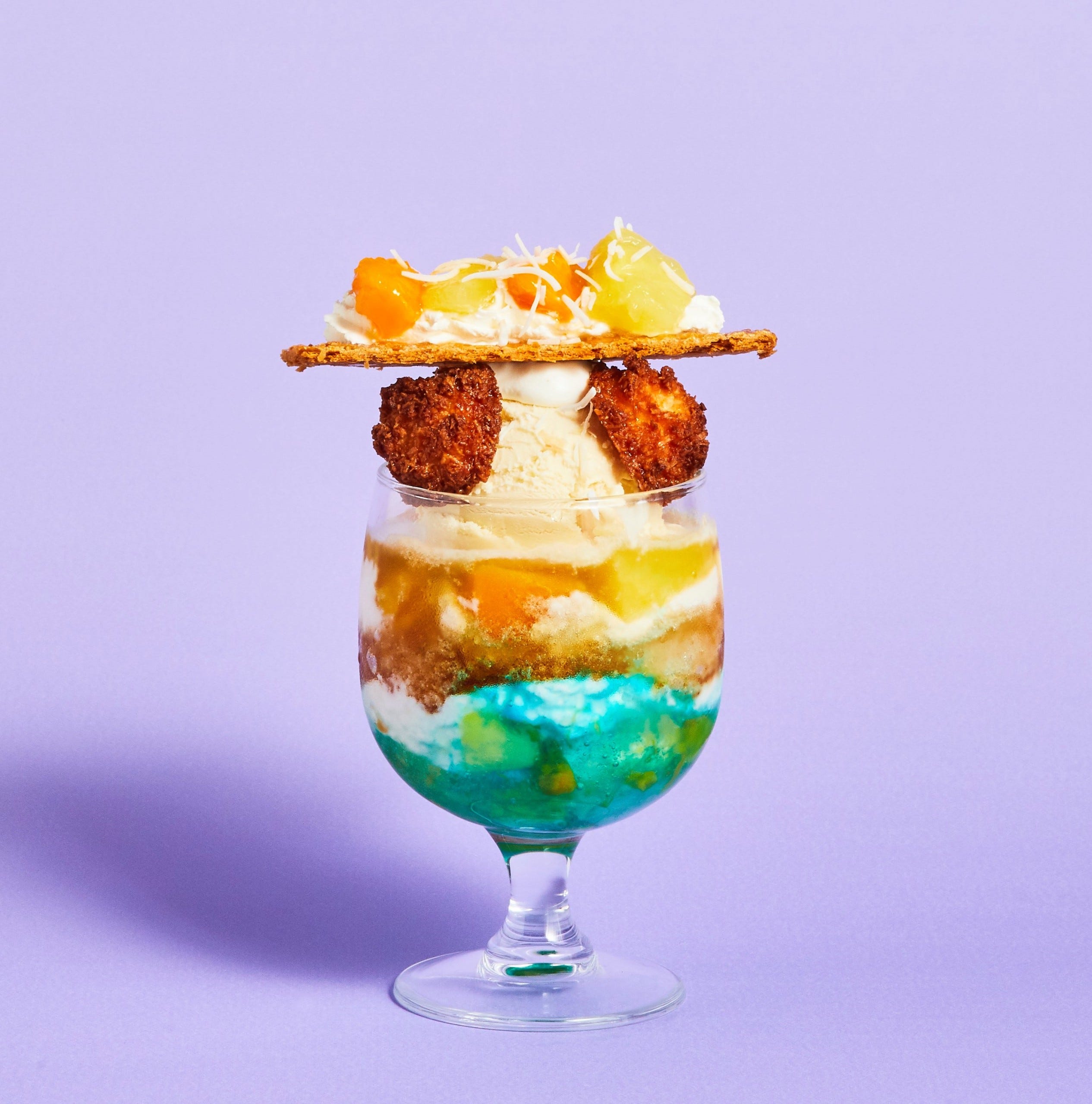 「紅茶とサマーフルーツのトロピカルパフェ氷」1,430円/販売期間:2023年8月15日(火)~9月4日(月) パイナップルとマンゴーといった夏フルーツと完熟バナナアイス、ブランドオリジナルの「J.S.ブレンドティー」のかき氷を合わせた、見た目もユニークなパフェ氷。サクサク食感のパイやロッシェココ、ひんやりかき氷、ブルーハワイのようなマンゴーとパイナップルのジュレが重なり、夏のビーチを思わせるようなパフェ氷に仕上げています。