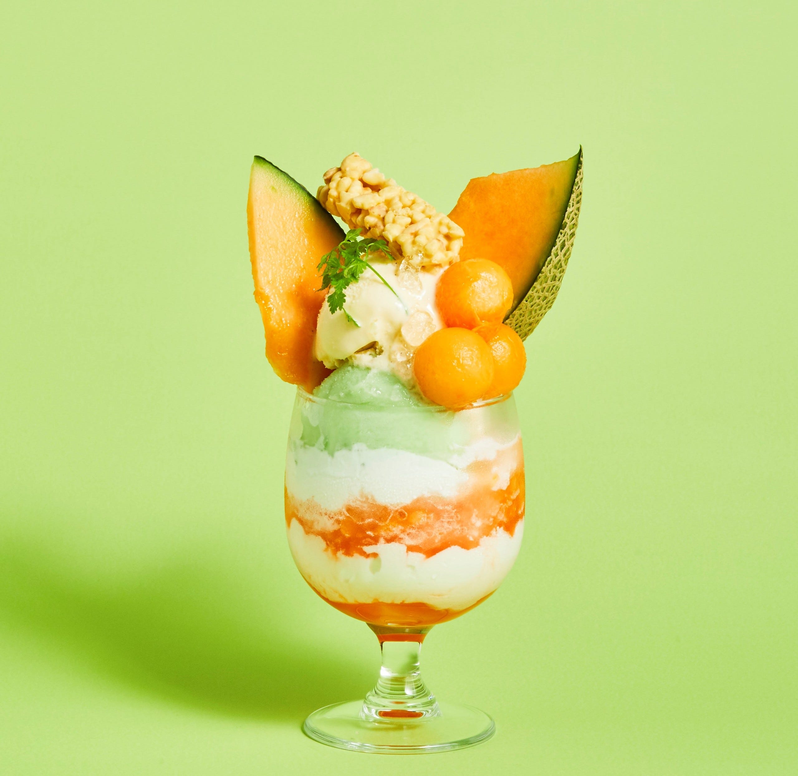 「国産メロンとバニラアイスのパフェ氷」1,430円/販売期間:2023年7月20日(木)~8月14日(月) 初夏に旬を迎える芳醇な香りのメロンを使ったメロンづくしのパフェ氷です。フレッシュなメロンを中心に、メロンシャーベットやみずみずしいかき氷、ぷるぷる食感のナタデココ、さらにはサクサクなとうきびチョコをトッピング。味わいの変化はもちろん、食感の違いも楽しんでください。