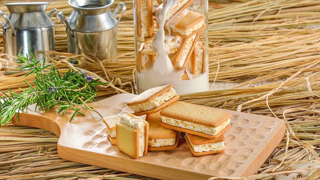 「京都みるくサンドクッキー」6個入993円、12個入1,695円 「京都みるくサンドクッキー」は、ミルクのコクをギュッと詰め込んださっくりしたクッキーで、コーンフレークを入れたソフトクリーム風味のチョコレートをサンド。ミルクのまろやかさとザクッとした食感を楽しめ、食べ応えも満点です。