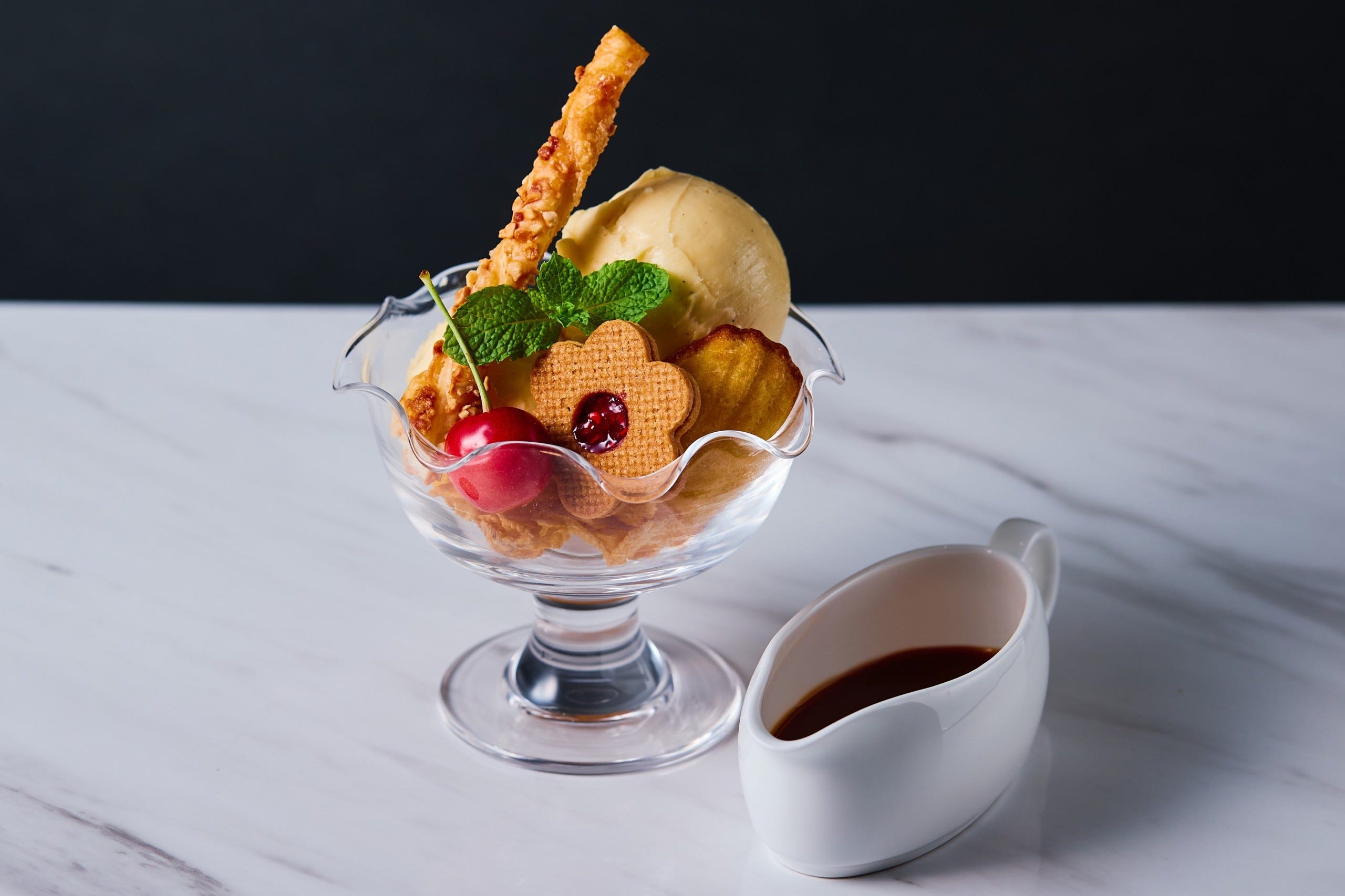 「ヴァニラアイスパルフェ」1,200円、ドリンクセット2,400円/販売期間:2023年7月1日(土)〜8月31日(木) 花形のサブレサンドが目を引く「ヴァニラアイスパルフェ」は、ミルフィーユスティック、マドレーヌ、さくらんぼでクラシカルな空気を纏ったパルフェに仕上げています。ハウスメイドのキャラメルソースをかけて、少し香ばしさをプラスするのもおすすめです。