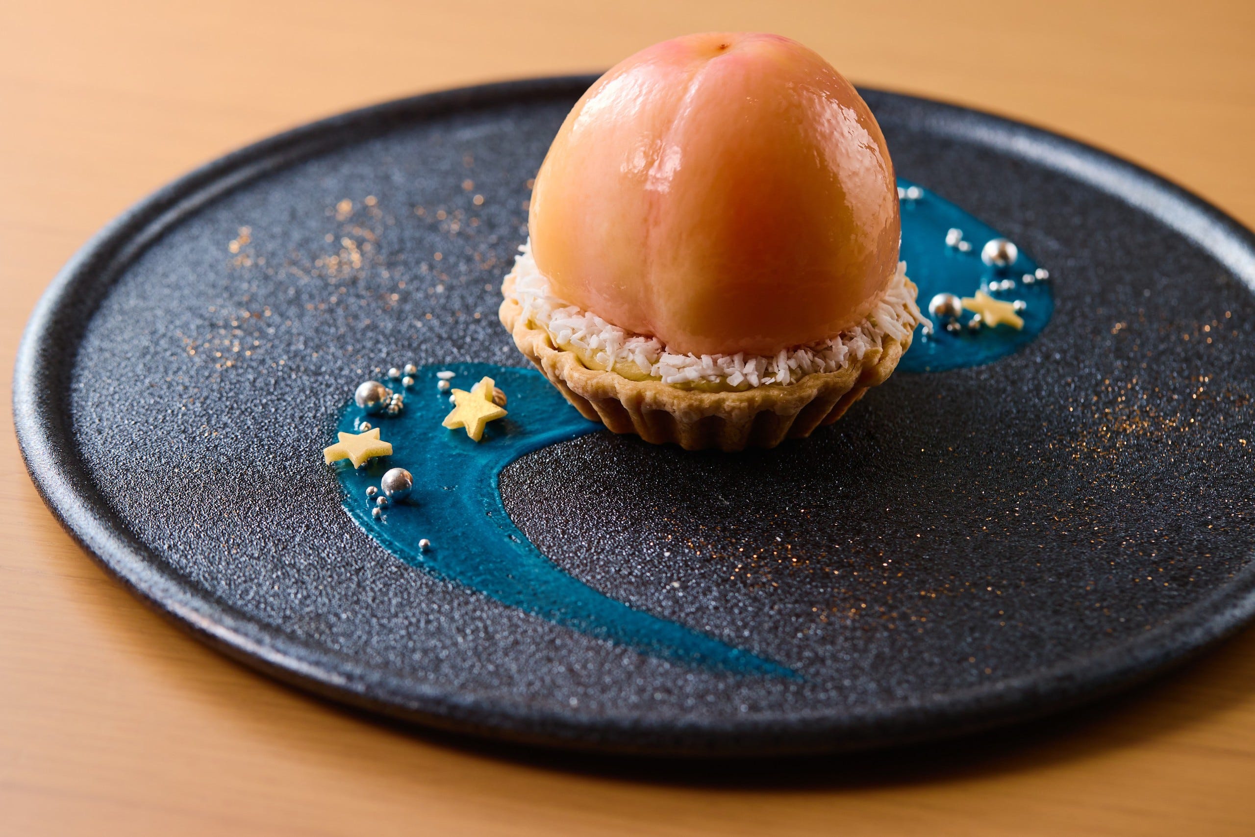 「桃に願いを。」1,500円、ドリンクセット2,500円/販売期間:2023年7月15日(土)〜8月27日(日) 夜の空を模したプレートに星が輝く天の川を描き、その上を大きな桃が流れるという、ファンタジックな世界観が表現された夏季限定ケーキ「桃に願いを。」。存在感抜群のジューシーな桃の果肉は、アールグレイティーとシャンパーニュ「モエ・エ・シャンドン」を加えたシロップでコンポートにし、内側にはホテルメイドの濃厚なヴァニラアイスクリームを忍ばせています。