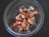 ボウルにラップをふんわりとかけて、600Wで2分加熱します。加熱されると、いちごの果汁がしっかりと出てきます。
