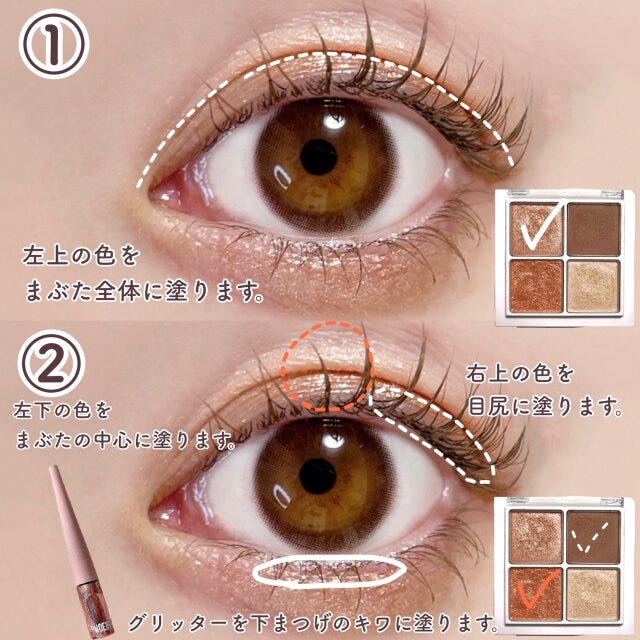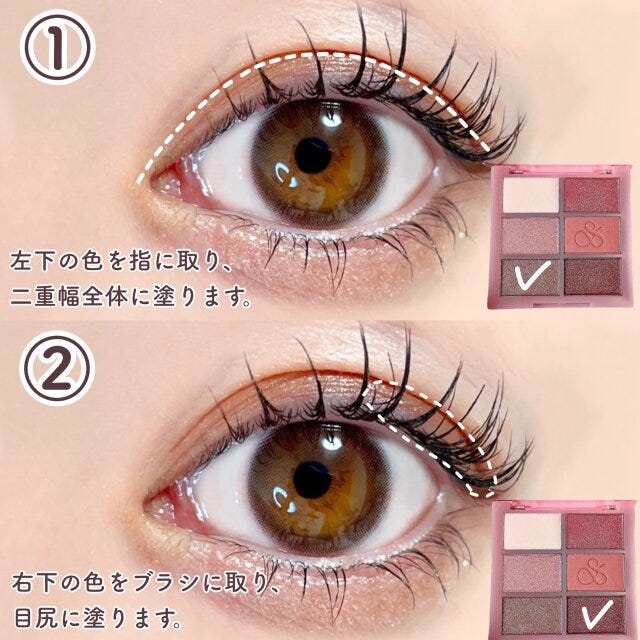 ② 右上の色を目尻に塗ります。左下の色を指に取り、まぶたの中心に塗ります。