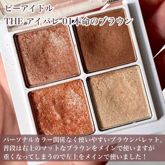 普段、ビーアイドル The アイパレ 01本命のブラウンを使う時、右上のマットなブラウンをメインに使いますが、夏のメイクでは重くなってしまうので今回は左上のラメブラウンをメインに使いました!