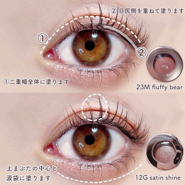 ③ 12G satin shineを指にとり、上まぶたの中心と涙袋に塗ります。
