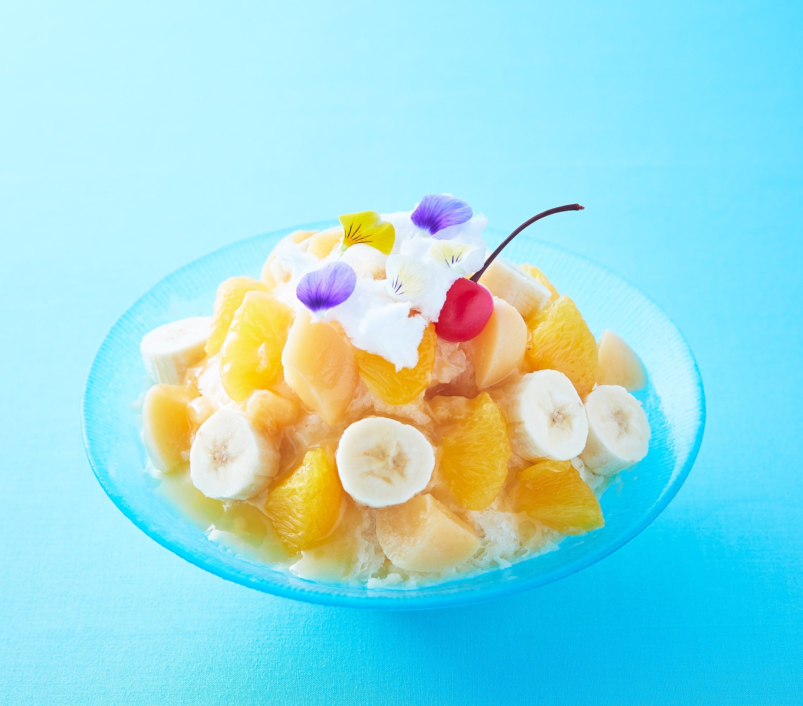 「なにわミックスジュース」3,500円/販売期間:2023年8月1日(火)~31日(木) ミックスジュース風味の氷、甘夏と桃のコンポート、バナナ、氷の下に隠れたバニラアイスの組み合わせは、まさに大阪名物ミックスジュース。トッピングには懐かしさを感じさせる綿菓子とチェリー。オレンジ、りんご、バナナ、桃を使い、氷とは風味を変えたミックスジュースソースをかけていただきます。