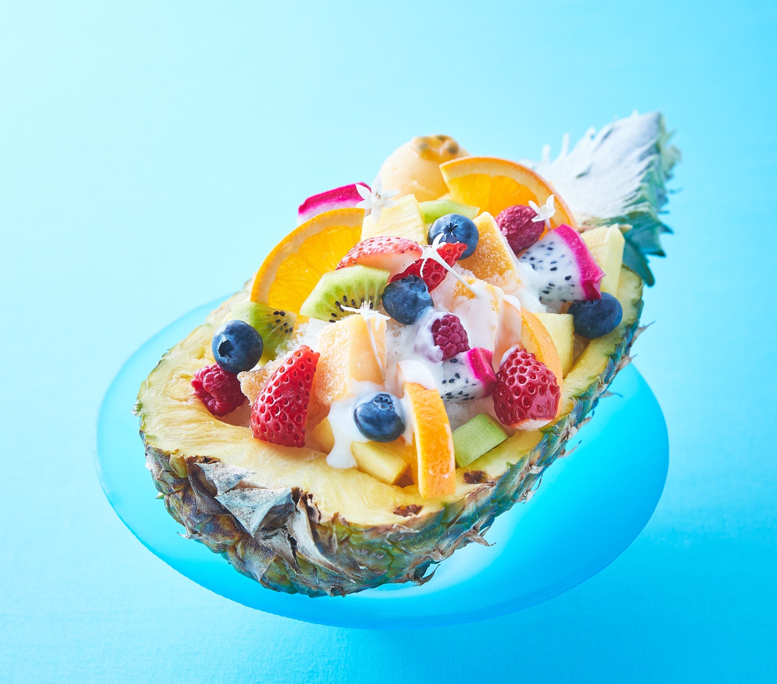 「10種のフルーツボート」5,000円/販売期間:2023年7月1日(土)~9月22日(金) 「10種のフルーツボート」の名前のとおり、パイナップルの器が印象的な、見た目も味もトロピカルな一品。パイナップル、桃のコンポートの上にミルク氷を削り、パッションマンゴーのアイス、パッションフルーツ、キウイ、オレンジ、ドラゴンフルーツ、ブルーベリー、ラズベリー、いちご、パイナップル、マンゴーを賑やかに飾っています。10種のフルーツと爽やかなヨーグルト風味のソースでペロリと食べられそうですね!
