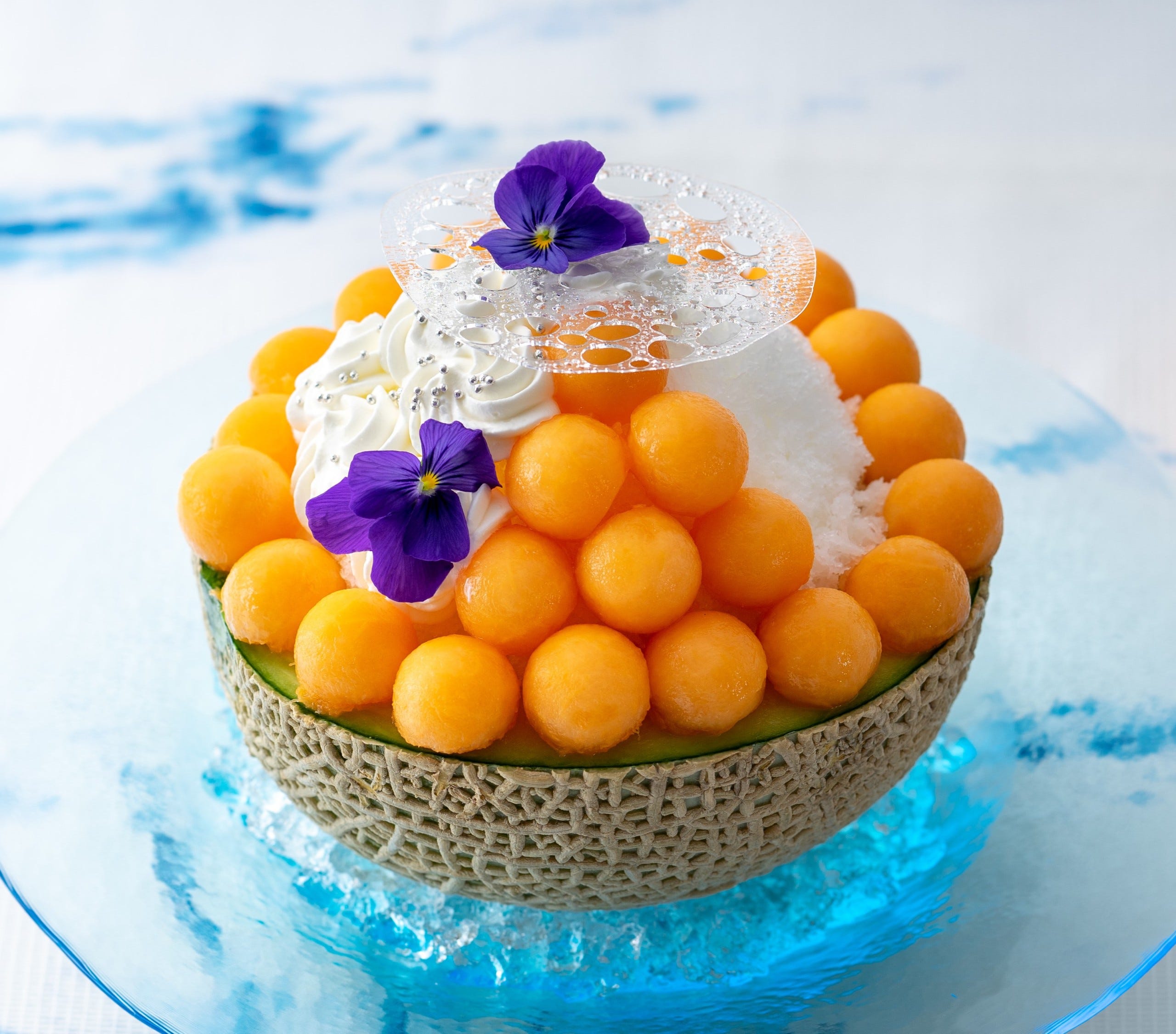 「デュアルマスクメロン」7,500円/販売期間:2023年7月1日(土)~9月22日(金) 赤肉と青肉、2種のマスクメロンを合わせて1玉分使った贅沢な新作のかき氷「デュアルマスクメロン」。青肉メロンを器に使い、ココナッツアイス、ミルク氷、丸くくり抜いた赤肉メロンと、メロン風味の生クリーム、アメ細工をトッピングしています。お好みで、赤肉メロンの果肉を使ったソースをかけて召し上がれ!
