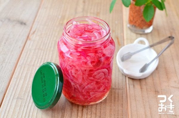 彩りが綺麗な紫玉ねぎの酢漬けレシピです。酢漬けにするため日持ちもよく、一週間分の作り置きに重宝します。