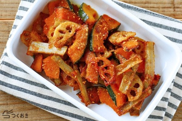 一週間のうち後半に食べたい場合は、冷凍保存するとよいでしょう。かぼちゃやれんこん、ごぼうは、片栗粉をまぶしてこんがり加熱して、調味料に絡めます。