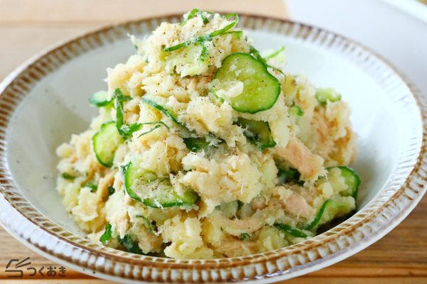 ツナときゅうり入りであっさり美味しい、簡単に調理できるポテトサラダです。