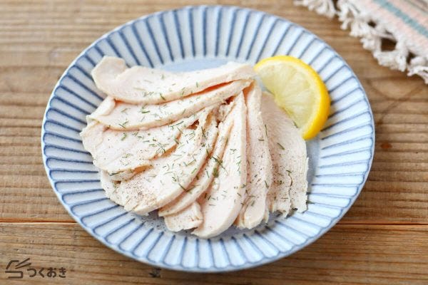 サラダチキンは、葉物野菜のトッピングにおすすめのレシピ。冷凍保存ができるため、一週間分の作り置きにもおすすめです。