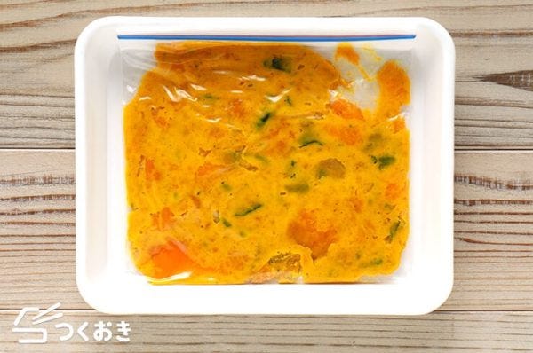 冷凍保存する際は、冷凍可の保存袋に入れ、できるだけ空気を抜いて作り置き保存してください。