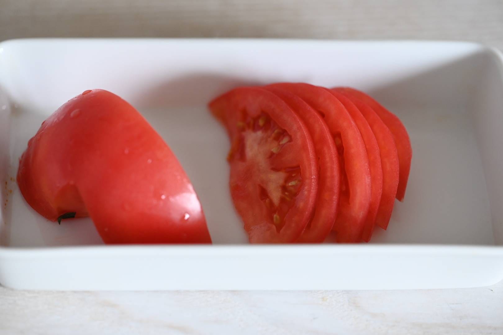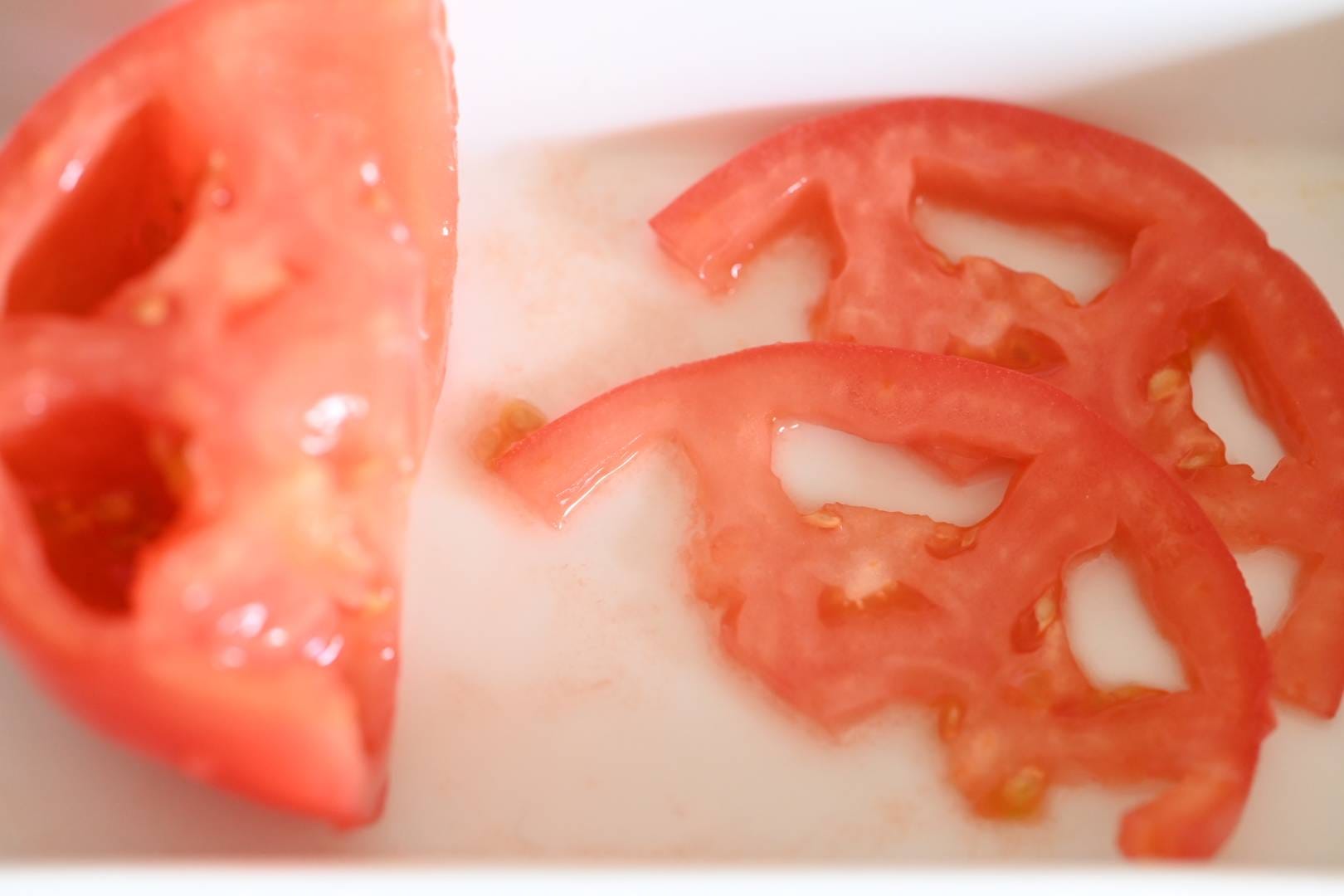 トマトは横4mm幅の薄切りにします。