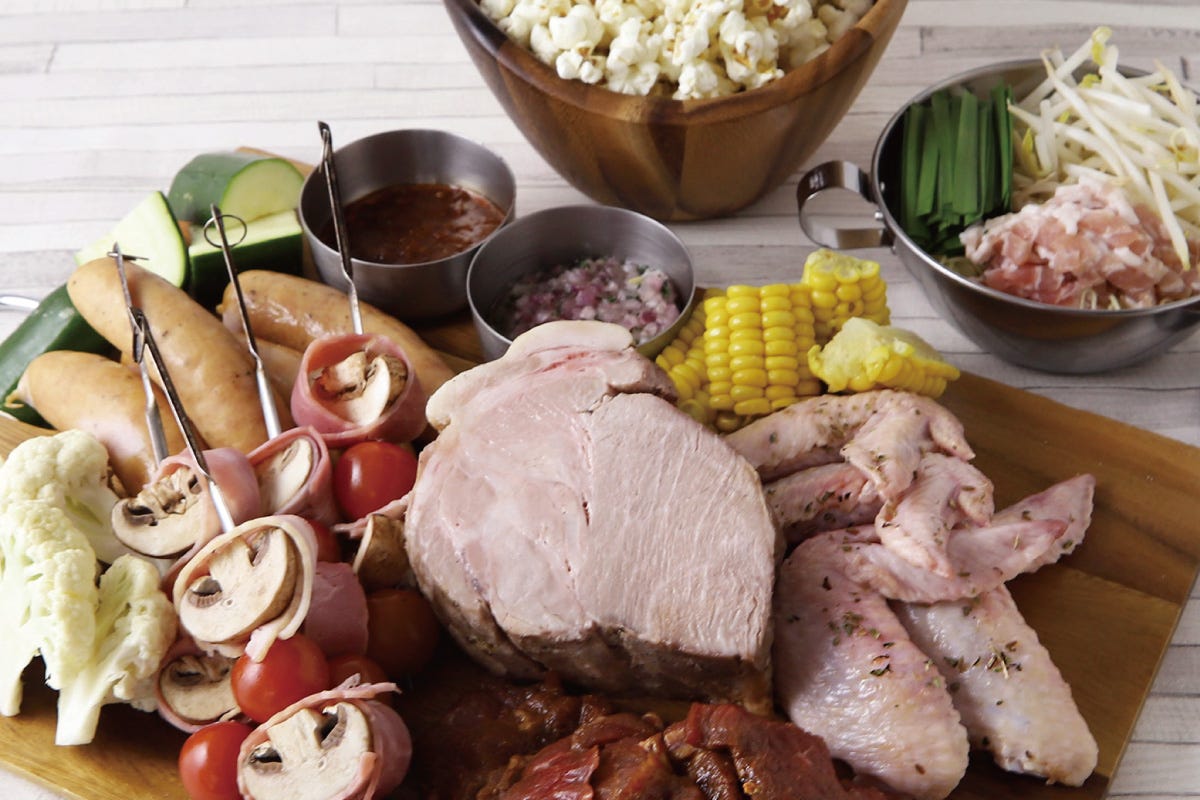 牛、豚肩ロース、チキンウイング、ソーセージ、ズッキーニ、六甲マッシュルームとベーコン、トマト串、カリフラワー、コーン、〆の香港風焼きそば、おつまみポップコーン(おかわり自由)