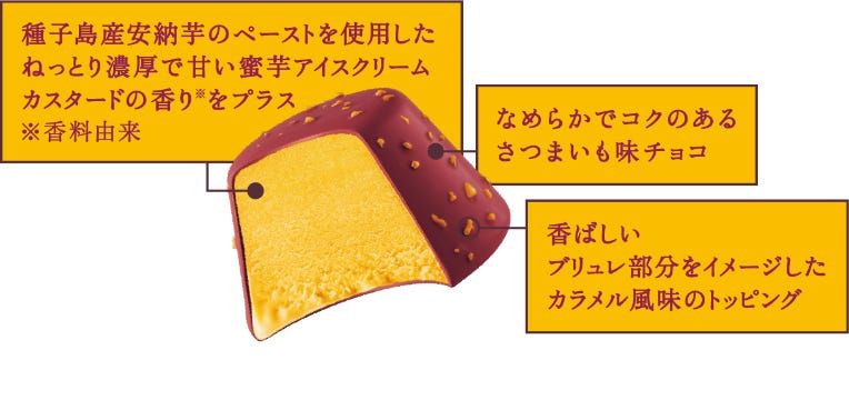 蜜芋アイスクリームには種子島産安納芋のペーストを使用し、ねっとり濃厚で甘い蜜芋の味わいが感じられる。さらにカスタードの香り※を効かせ、さつまいも味チョコには香ばしいブリュレ部分をイメージしたカラメル風味のトッピングを混ぜ込むことで、蜜芋ブリュレの味わいと食感の再現性を高めている。※香料由来