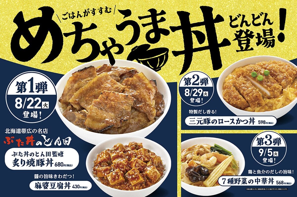 同日より「めちゃうま丼 どんどん登場!」と称し、「丼」商品4種類が全国のファミリーマートで順次発売された。第1弾は『ぶた丼のとん田監修 炙り焼豚丼』と『醤の旨味きわだつ!麻婆豆腐丼』の2種となる。