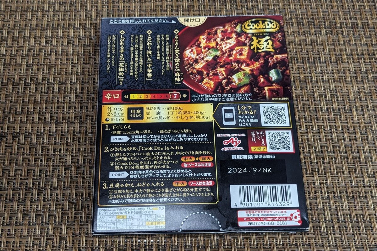 また、パッケージにも豆腐を湯通ししたり豚肉をしっかり炒めたりと、レシピサイトや動画でプロの中華料理人が麻婆豆腐を作るときに教えるコツも書かれており、守って作れば本格的な仕上がりになることが予想できる。