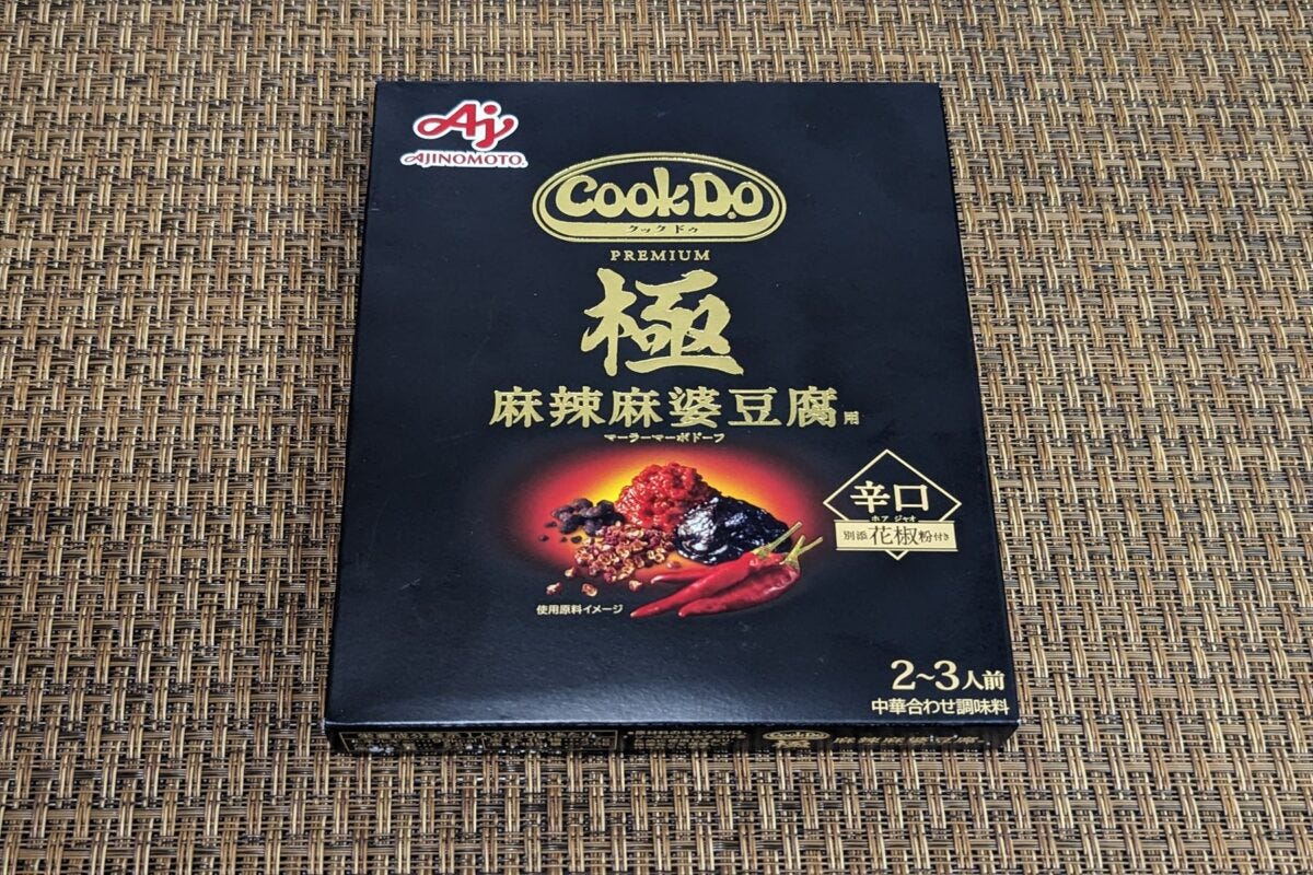 それは、19日から全国販売を開始している<極(プレミアム)麻辣麻婆豆腐用>。黒の波形に金の文字、中心には料理でなく使用している食材が描かれた本気度をひしひしと感じるパッケージである。