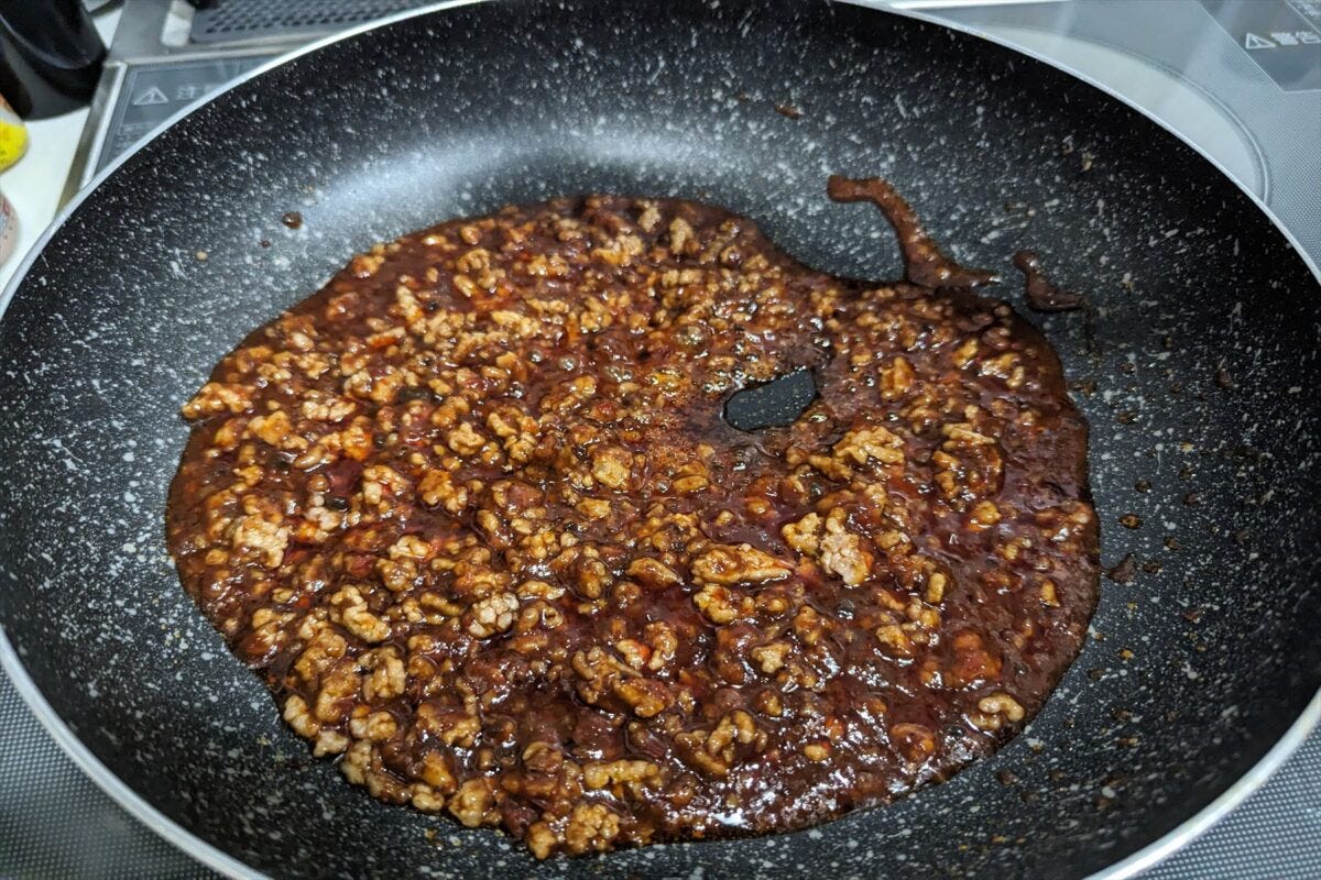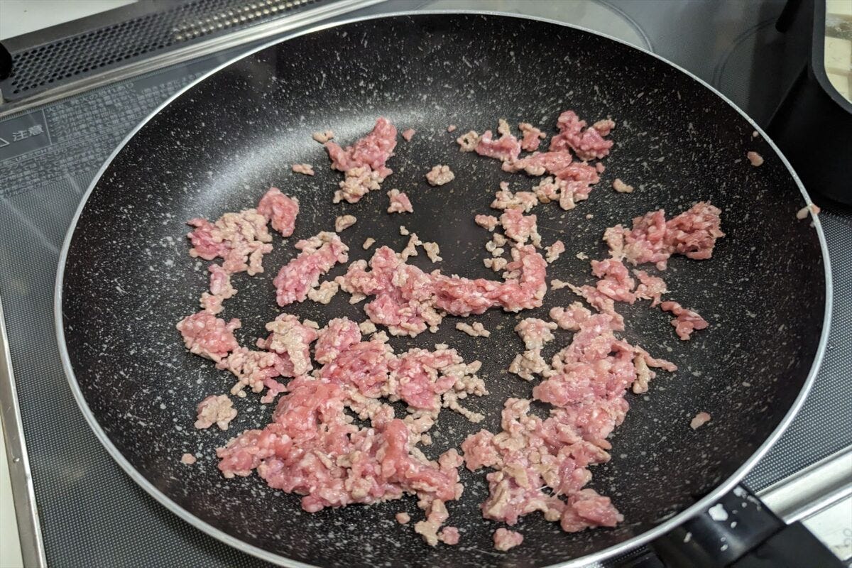 全体の作り方をざっと説明すると、まずはひき肉を炒め...