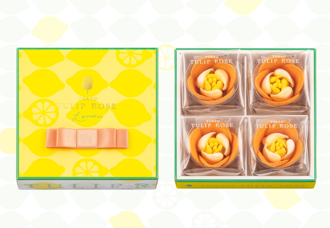 「チューリップローズ レモン」4個入り972円/販売時期:2023年7月21日(金)~8月31日(木)ごろ ※販売期間は在庫状況により前後する場合があります。 一新したパッケージデザインは、フレッシュなレモンイエローをベースに、爽やかなグリーンのラインで縁どられています。背景には甘酸っぱいレモンのイラストも描かれ、見た目だけでも夏を存分に感じられそう!