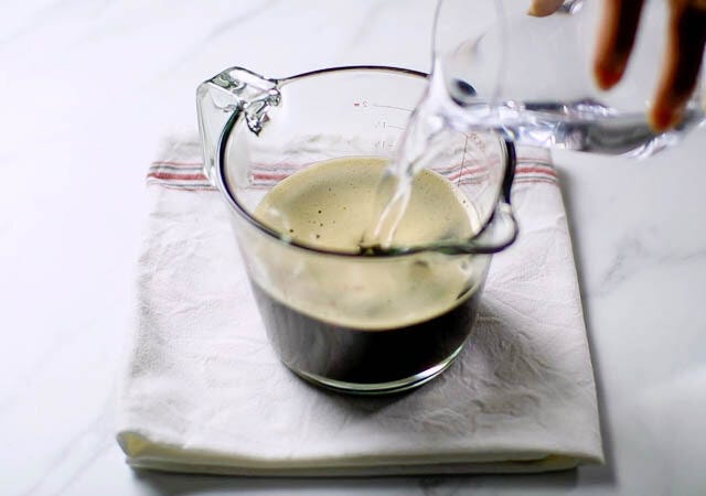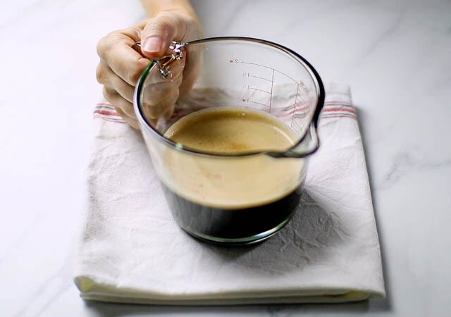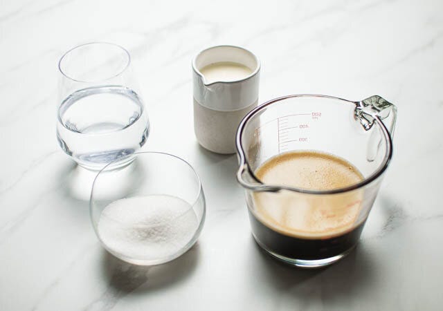 ① エスプレッソコーヒーをいれ、熱いうちにグラニュー糖を加えて混ぜて溶かします。