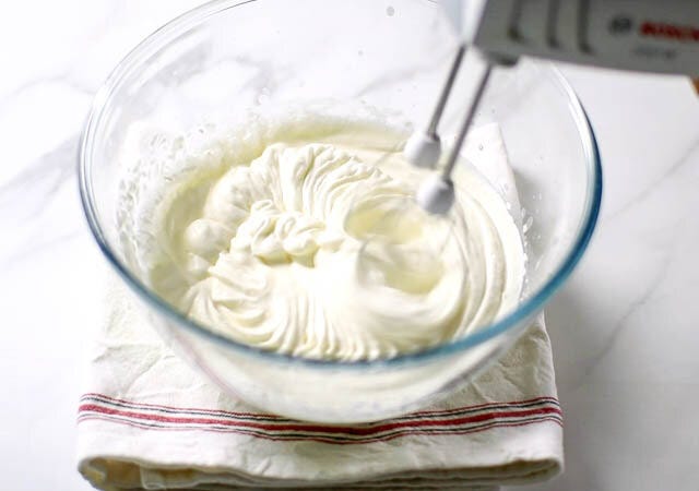 ② 電動ミキサーでツノが立つまで泡だてます。