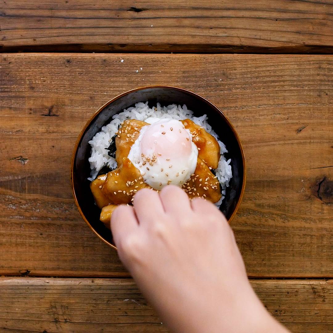 器にごはん、ちぎった焼き海苔、④、温泉卵、白いりごまを盛り付けて完成です。