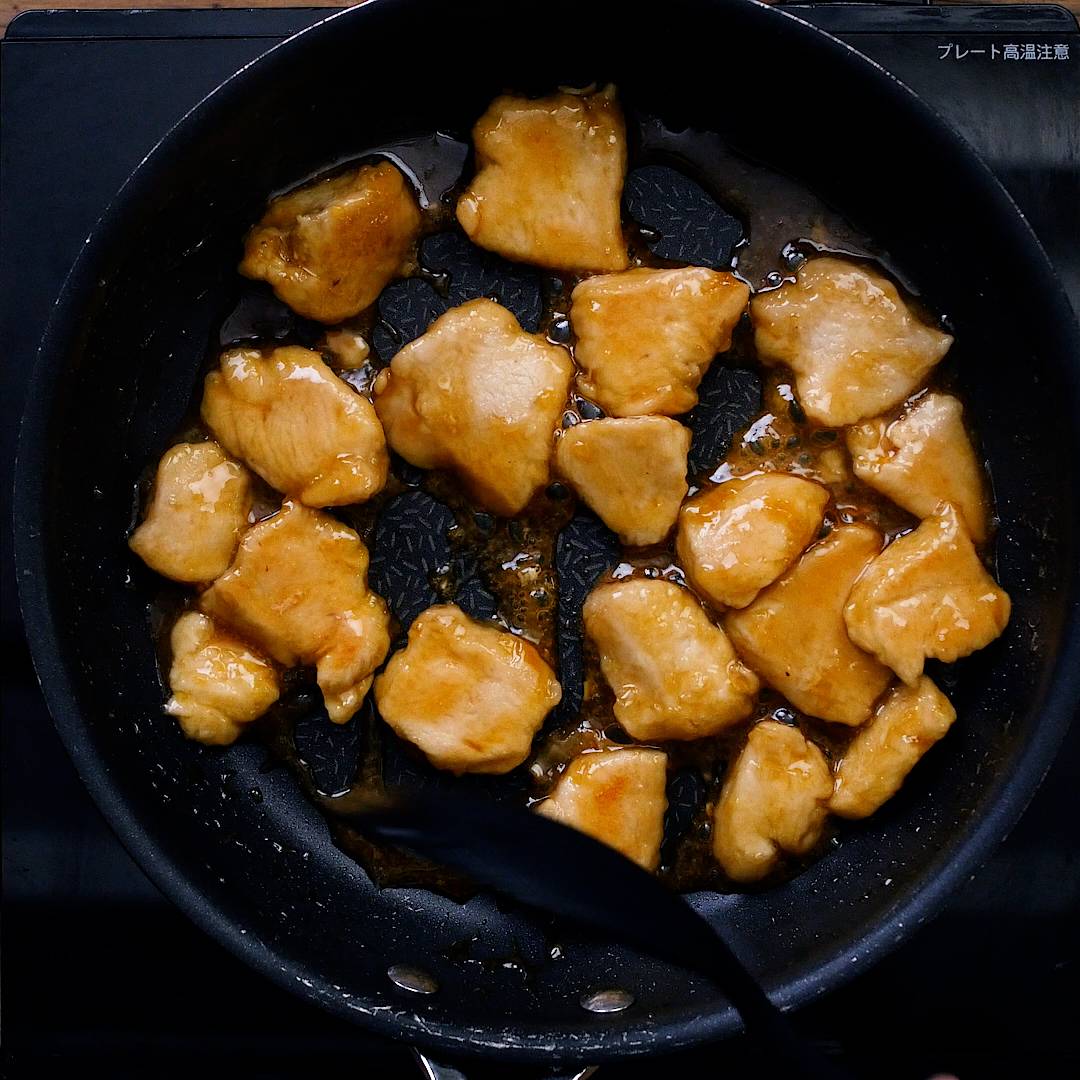 フライパンにサラダ油を引いて中火で熱し、鶏肉を並べ入れます。全体に焼き色がつくまで焼いてフタをし、弱火で5分ほど蒸し焼きにします。