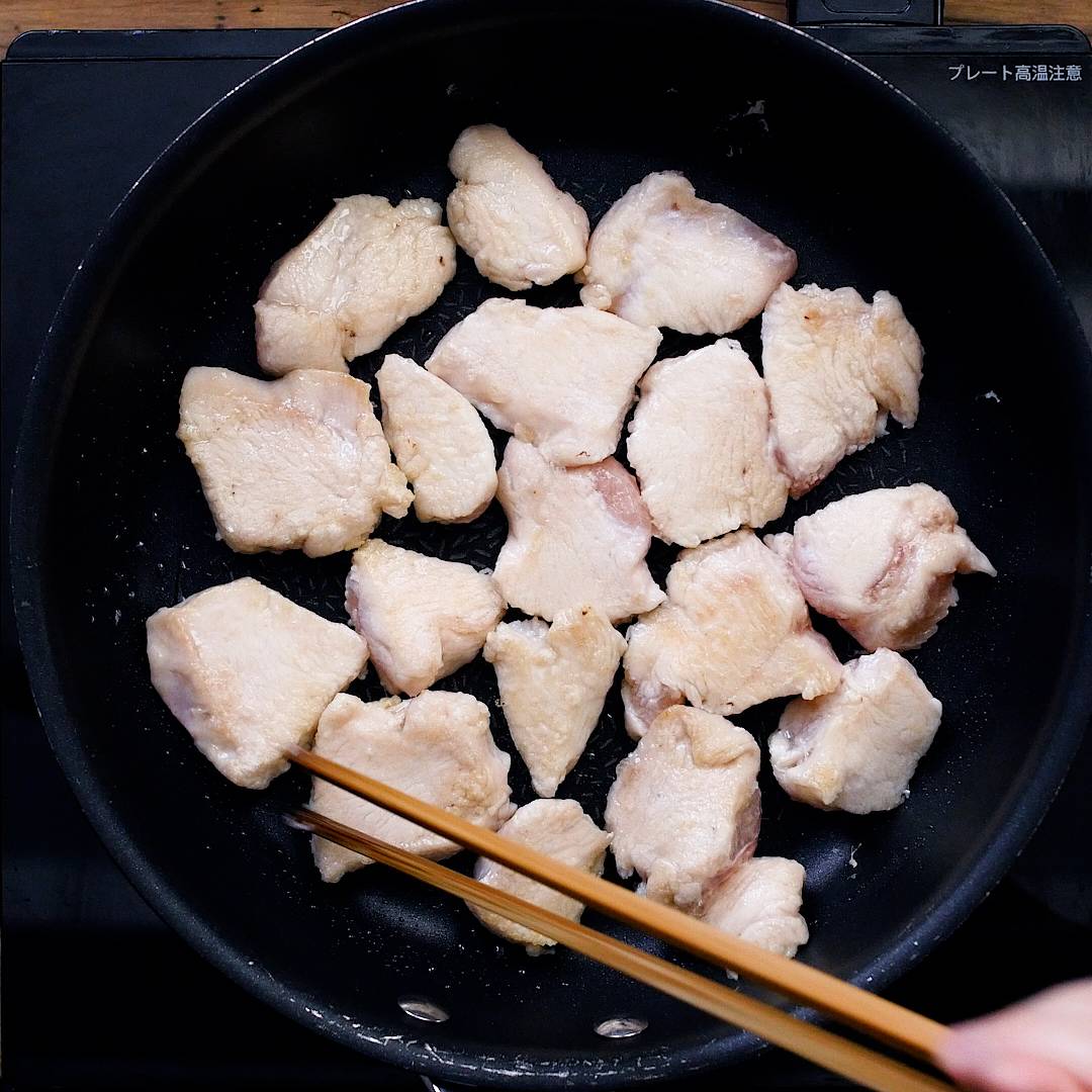 鶏肉は余分な皮と脂を除き、ひと口大に切ります。