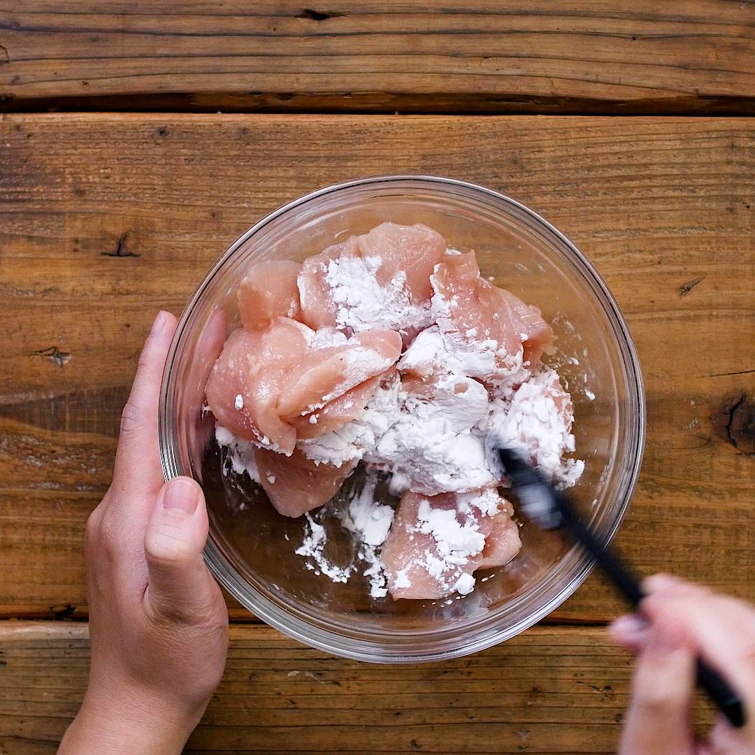 ボウルに鶏肉、塩、酒、しょうがを入れて揉み込み、片栗粉をまぶします。