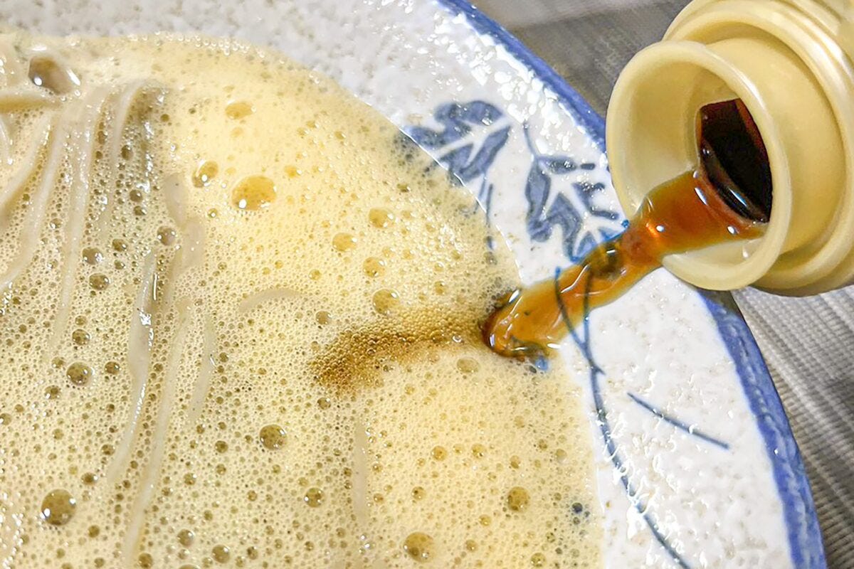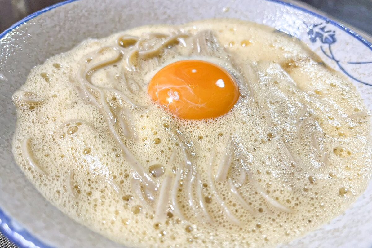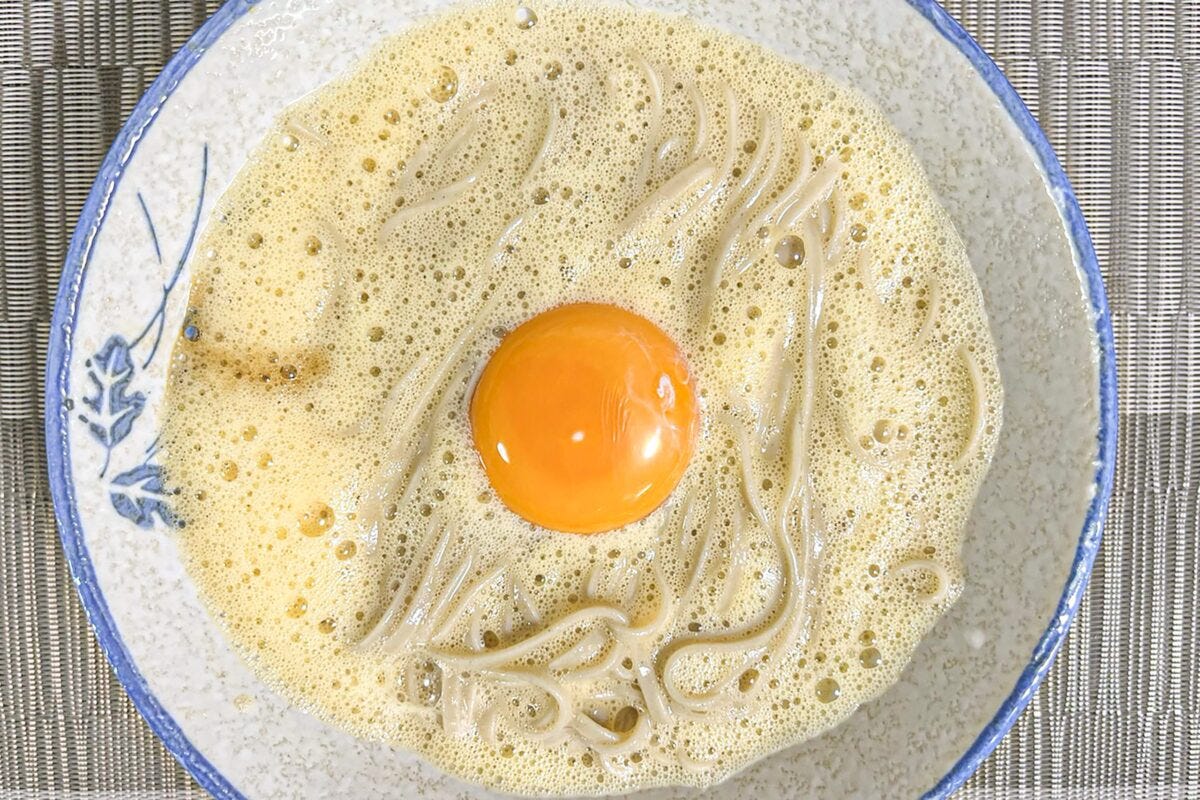 泡立ったら、器の端からそばつゆを投入し、上に黄身を乗せれば完成だ。