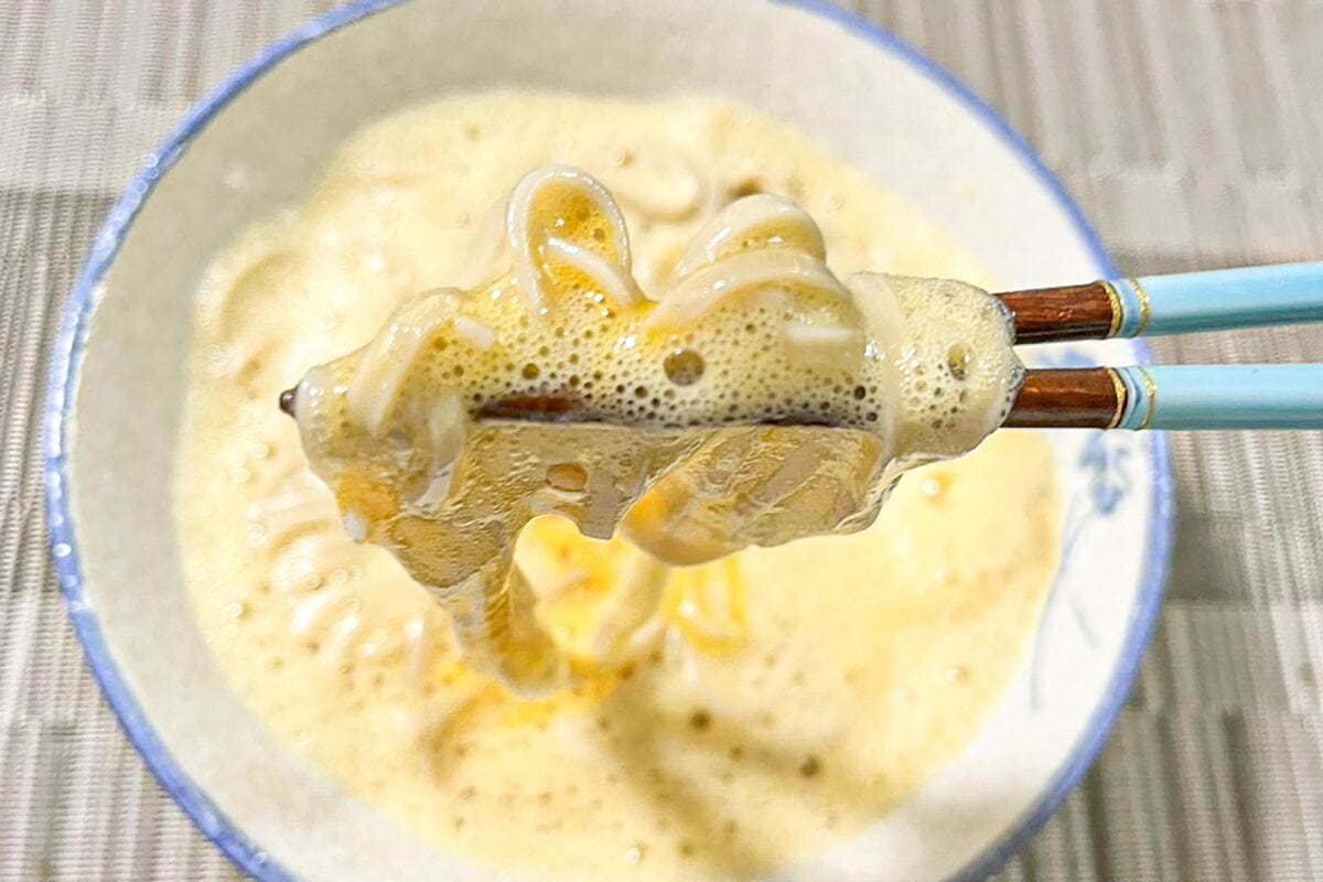 こちらが完成した「ふわふわ月見そば」だ。泡立った卵によってトロトロとしており、そばつゆの香りも併せてかなり美味しそうだ。