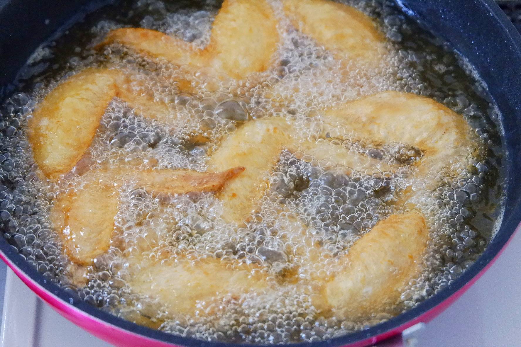 両面揚げたら、バットに取り出します。残りの半量も同じように揚げます。この時点では、揚げ色がついていなくても問題ありません。