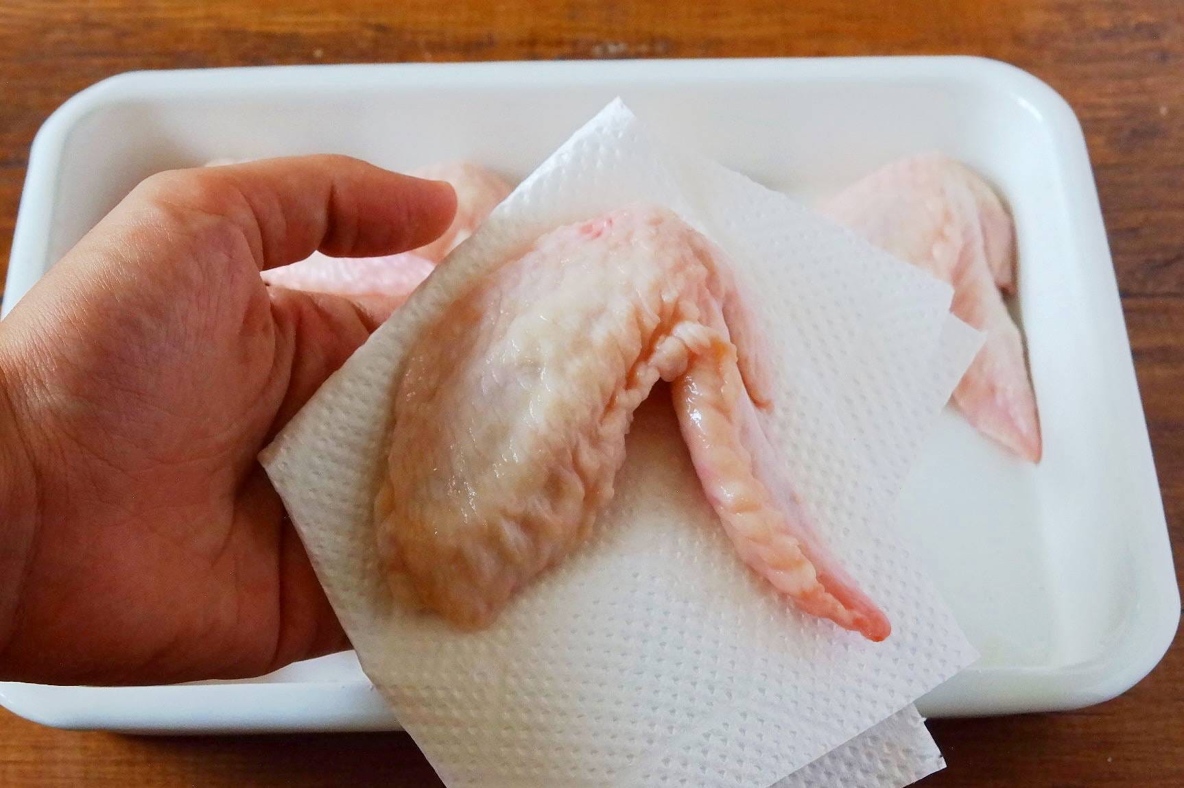 キッチンペーパーで鶏手羽先の水分を両面拭き取ります。水気が残っていると揚げるとき油がはねるため、しっかり拭いてください。