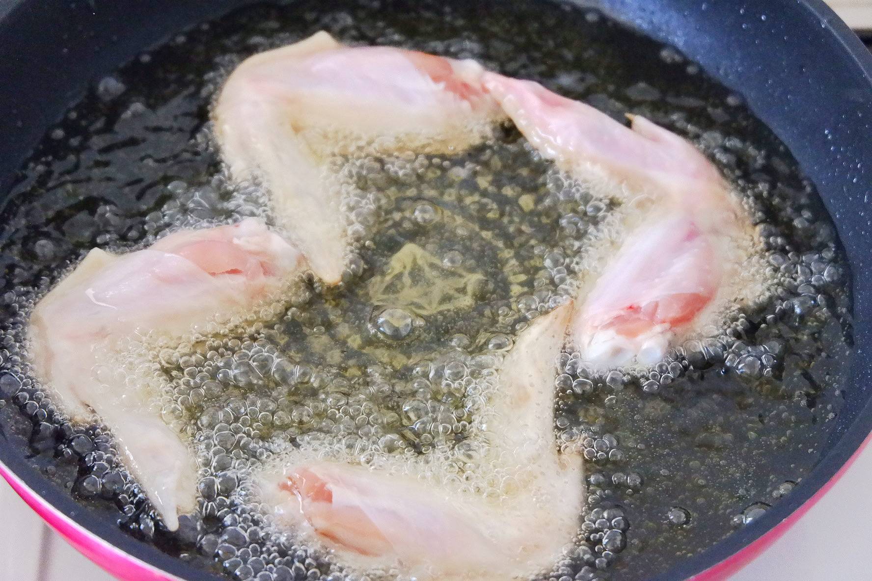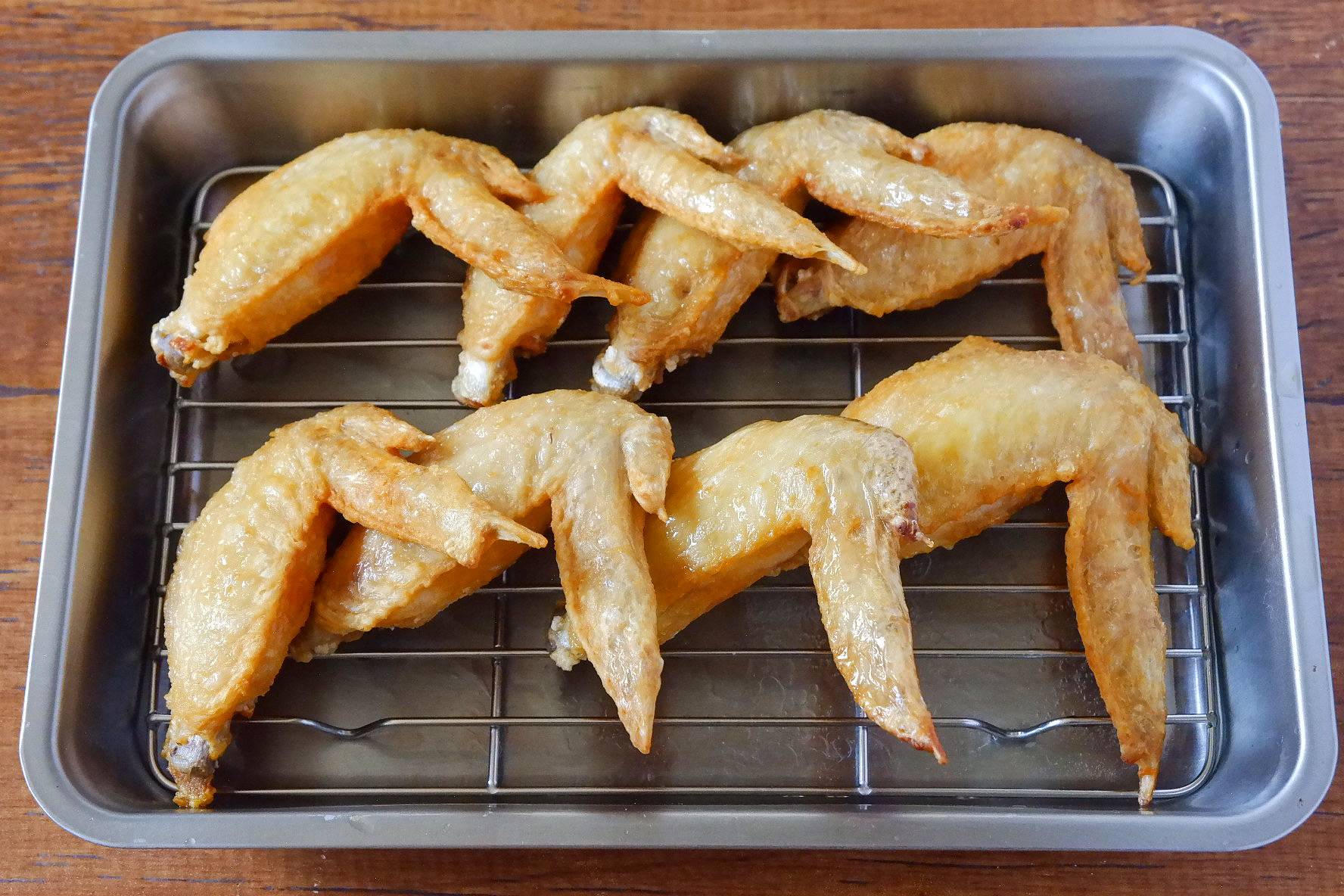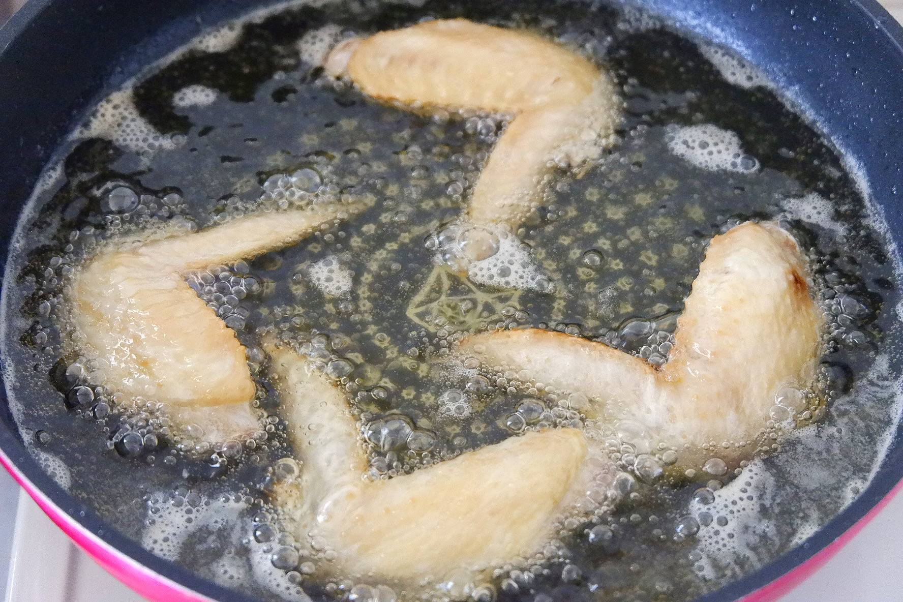 鶏手羽先を皮目から入れ、1分揚げたら裏返します。全体がきつね色になるまで1分ほど揚げます。すでに鶏手羽先が加熱されているため、一度にすべて入れても問題ありません。