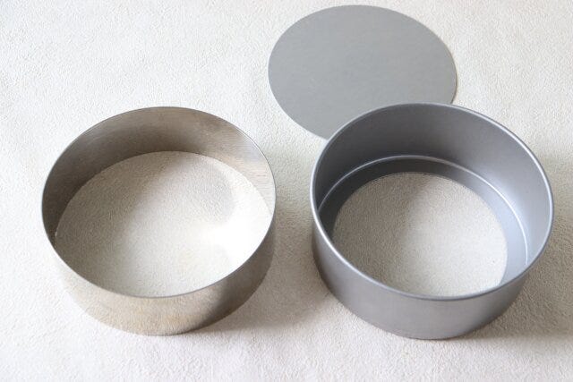 15cmサイズの丸型を使用します。左は底が無いタイプのセルクルで、レアチーズケーキやムースなど、冷やし固めて外すお菓子を作る時におすすめの型です。