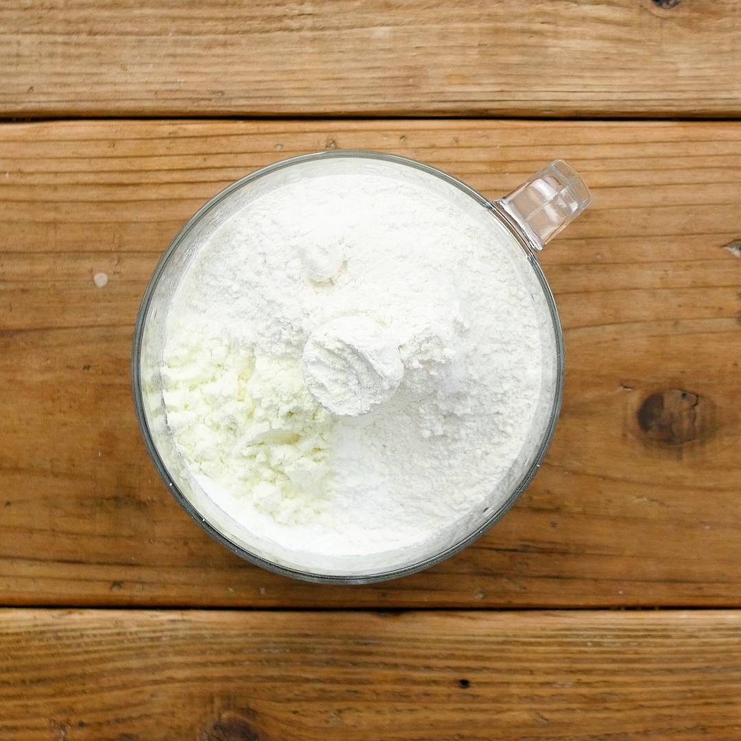 冷えたバターを入れて、全体がサラサラになるまでフードプロセッサーを回します。