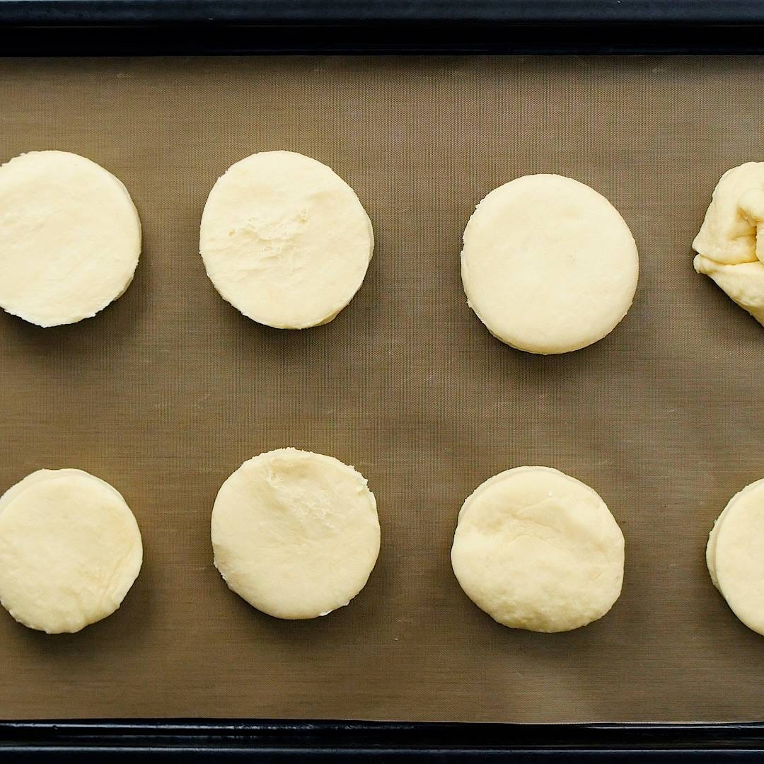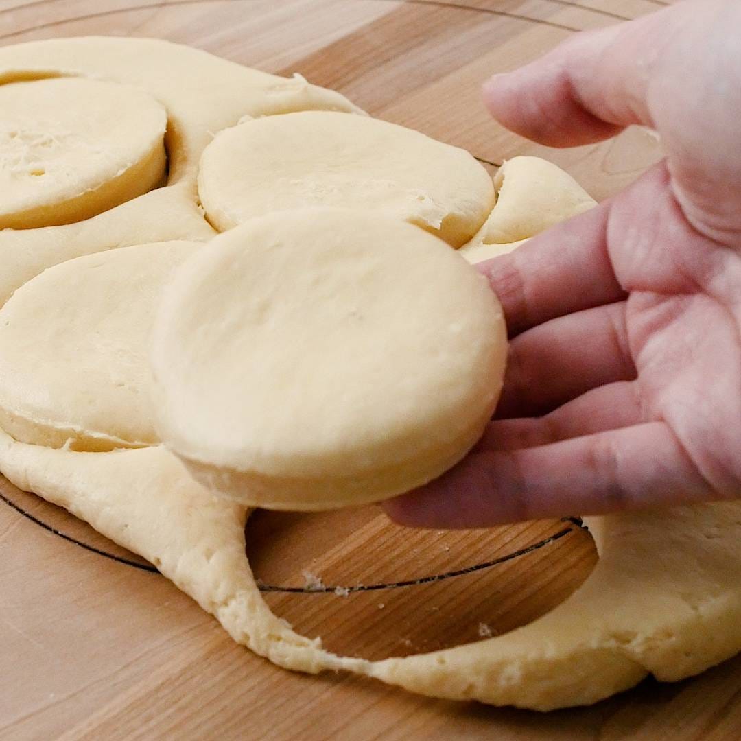 余った生地はもう一度まとめてのばして三つ折りにしてセルクルで抜きます。残った生地も切ります。