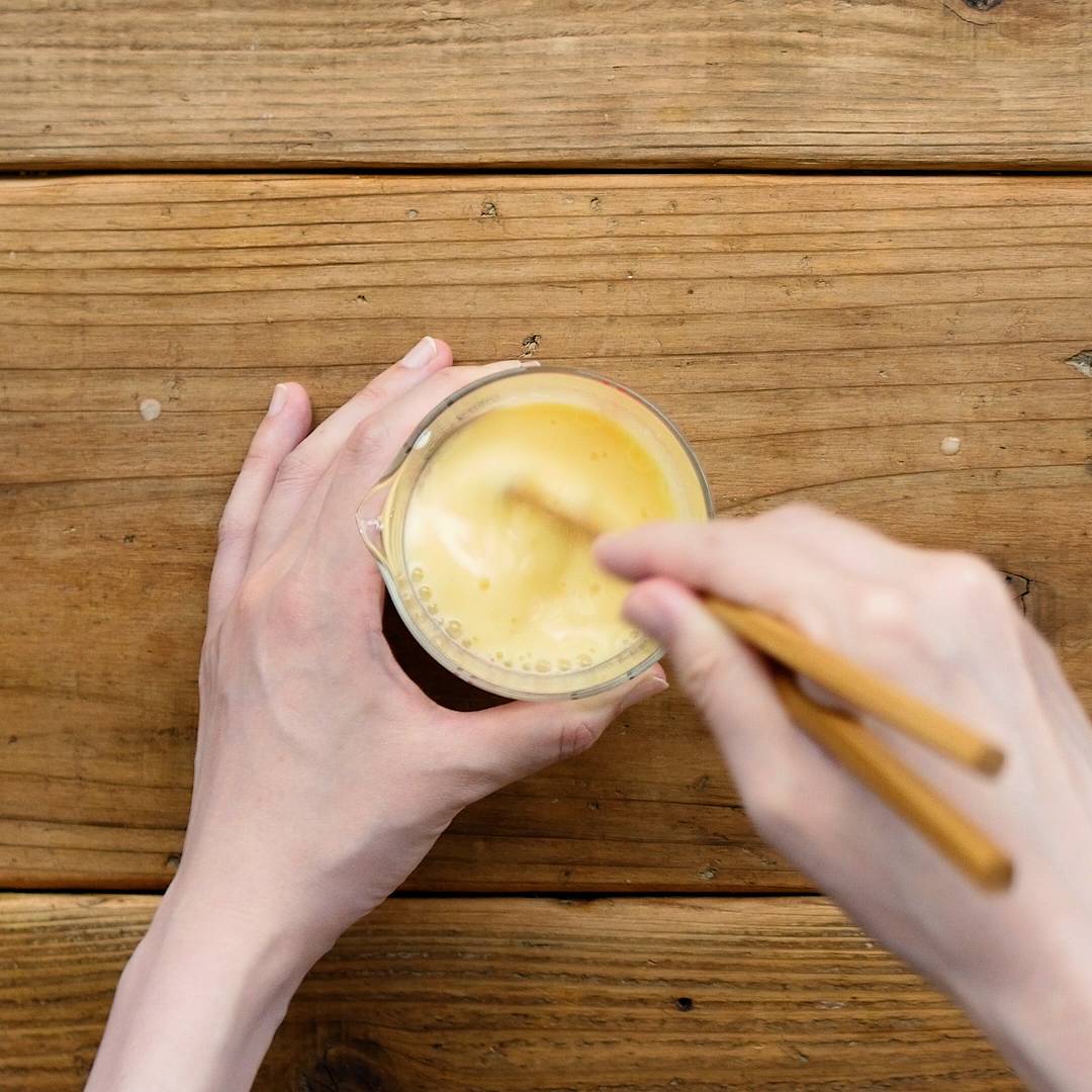 計量カップに水、ヨーグルト、卵を入れ、軽く混ぜ合わせます。