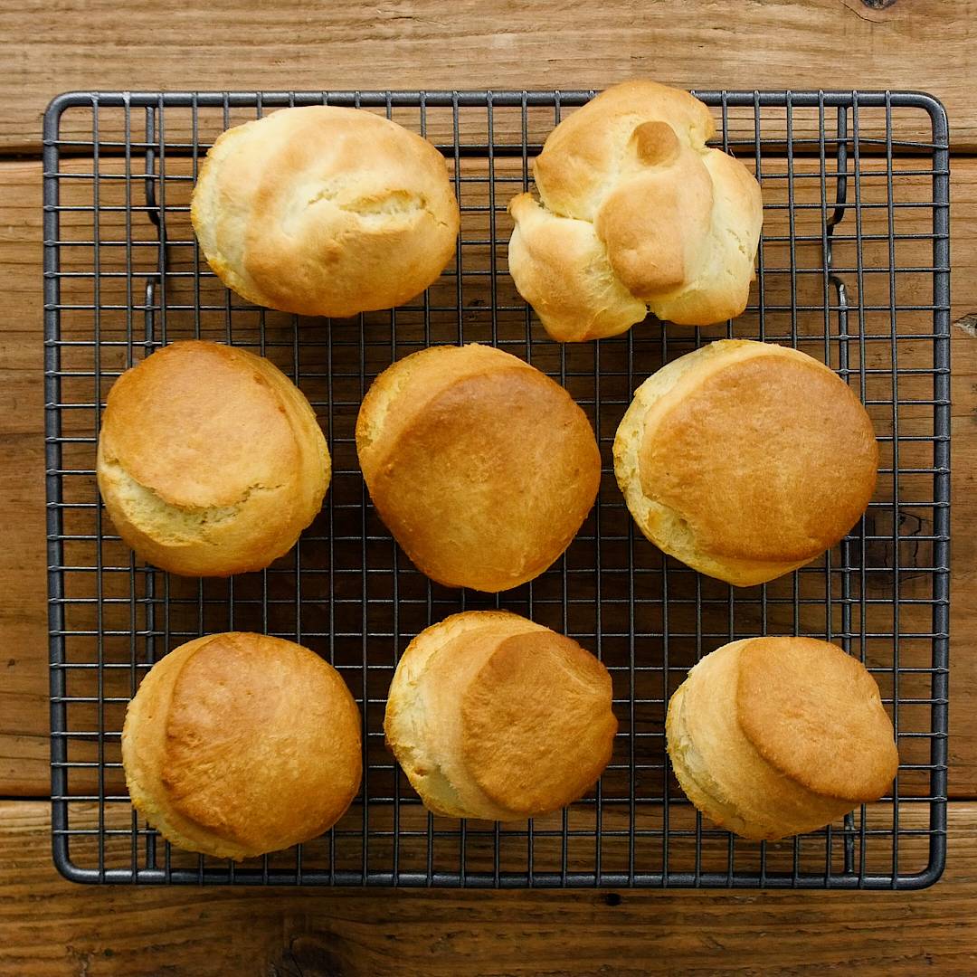 ・薄力粉 … 100g・強力粉 … 150g・塩 … 3g・グラニュー糖 … 20g・ベーキングパウダー … 10g・重曹 … 2g・バターミルクパウダー … 10g・発酵バター(無塩) … 70g・水 … 60g・プレーンヨーグルト(無糖) … 50g・卵 … 1個仕上げ・バター(有塩) … 適量・メープルシロップ … 適量【下ごしらえ】アメリカンビスケット