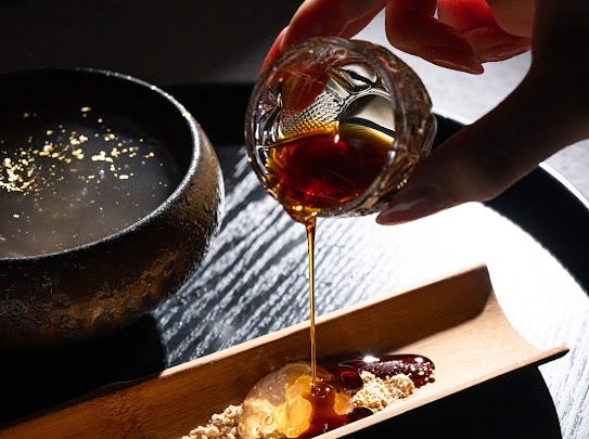 「笹屋昌園」オリジナルの「白わらび餅」は、新感覚の豆乳わらび餅。京都の老舗豆腐屋「とようけ屋山本」がつくる豆乳は濃厚で、コクと風味がひと味違います。黒ごまと黒蜜の革新的な組み合わせが、もちもちでぷるぷるな豆乳わらび餅とマッチし、生み出された絶妙な口当たりをぜひ一度試してみて。