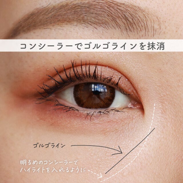 明るめのコンシーラーを使って、ハイライトを入れる気持ちで写真の点線を明るくすることで、ゴルゴラインが目立たなくなります。