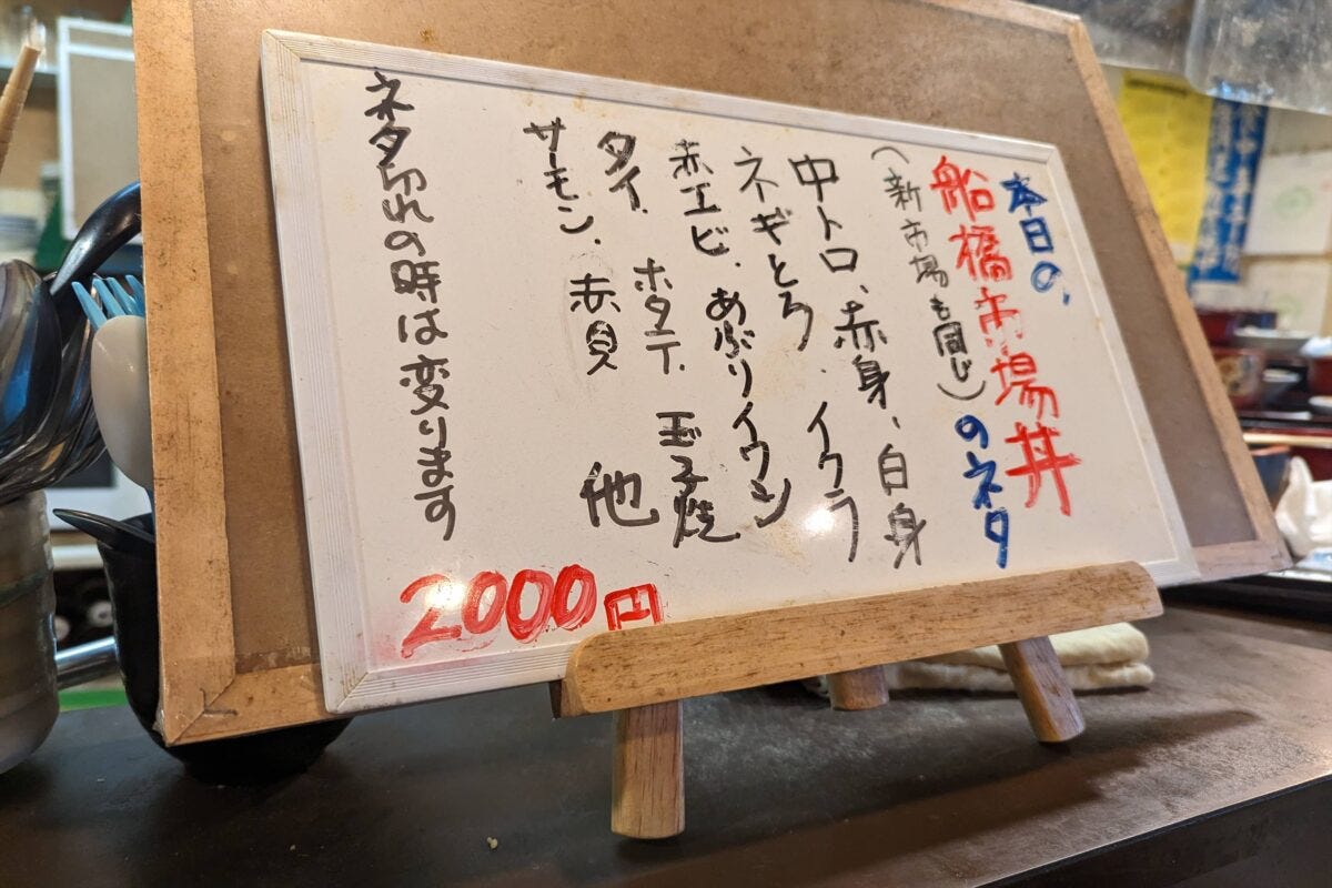 船橋市場丼は2000円とリーズナブルなだけでなく、市場で仕入れた新鮮な具材がこれでもかとのっており、市場メシファンをはじめ観光客にも人気が高い。今回はそれにプラス500円で注文できる、新船橋市場丼を注文。