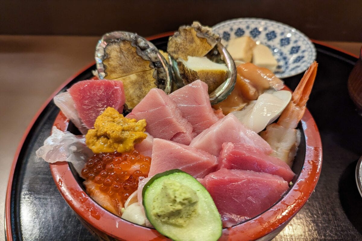 新船橋市場丼は船橋市場丼の具材にうにとあわびがのった超豪華な丼で、そのクオリティは値上げ前と比べてもまったく変わっていなかった。