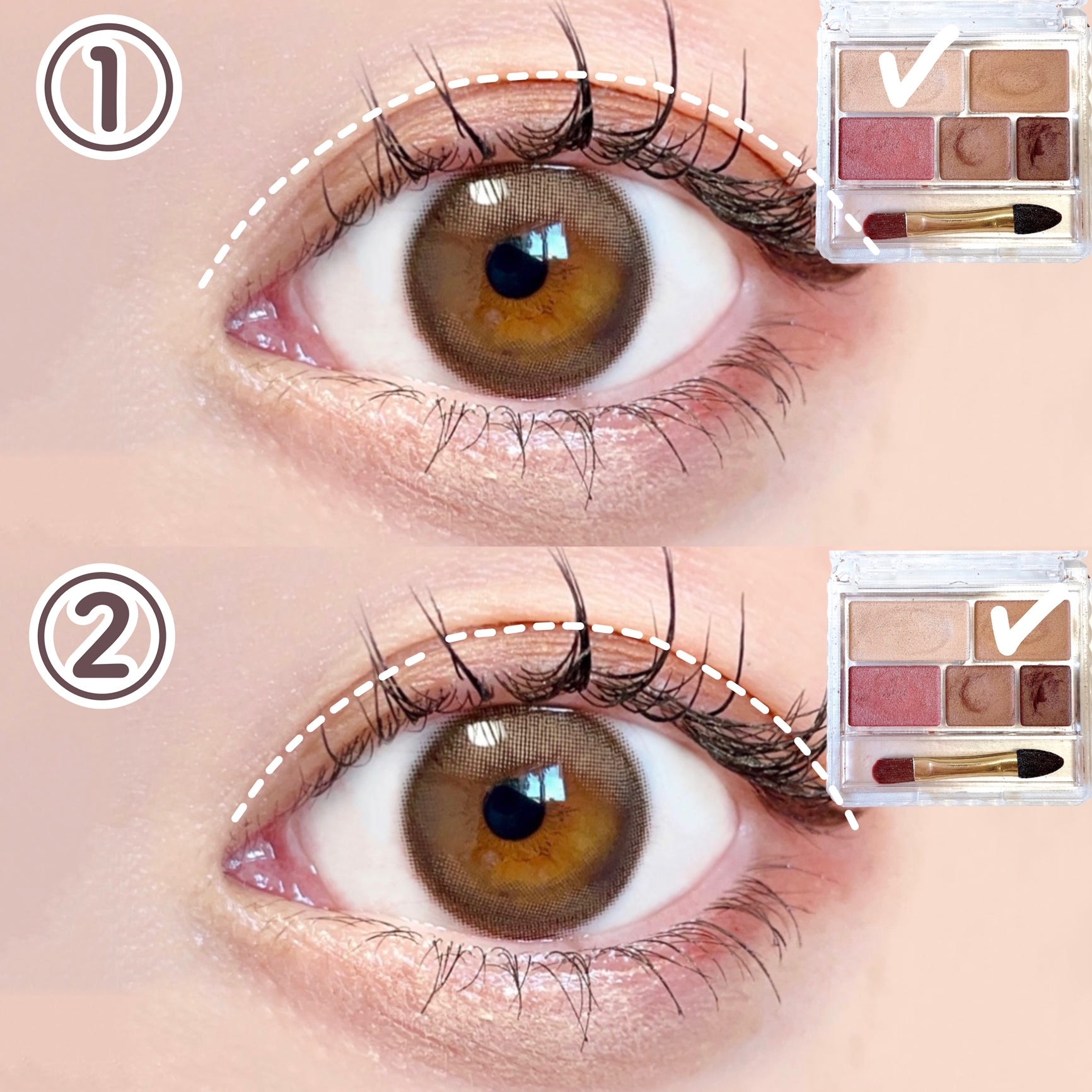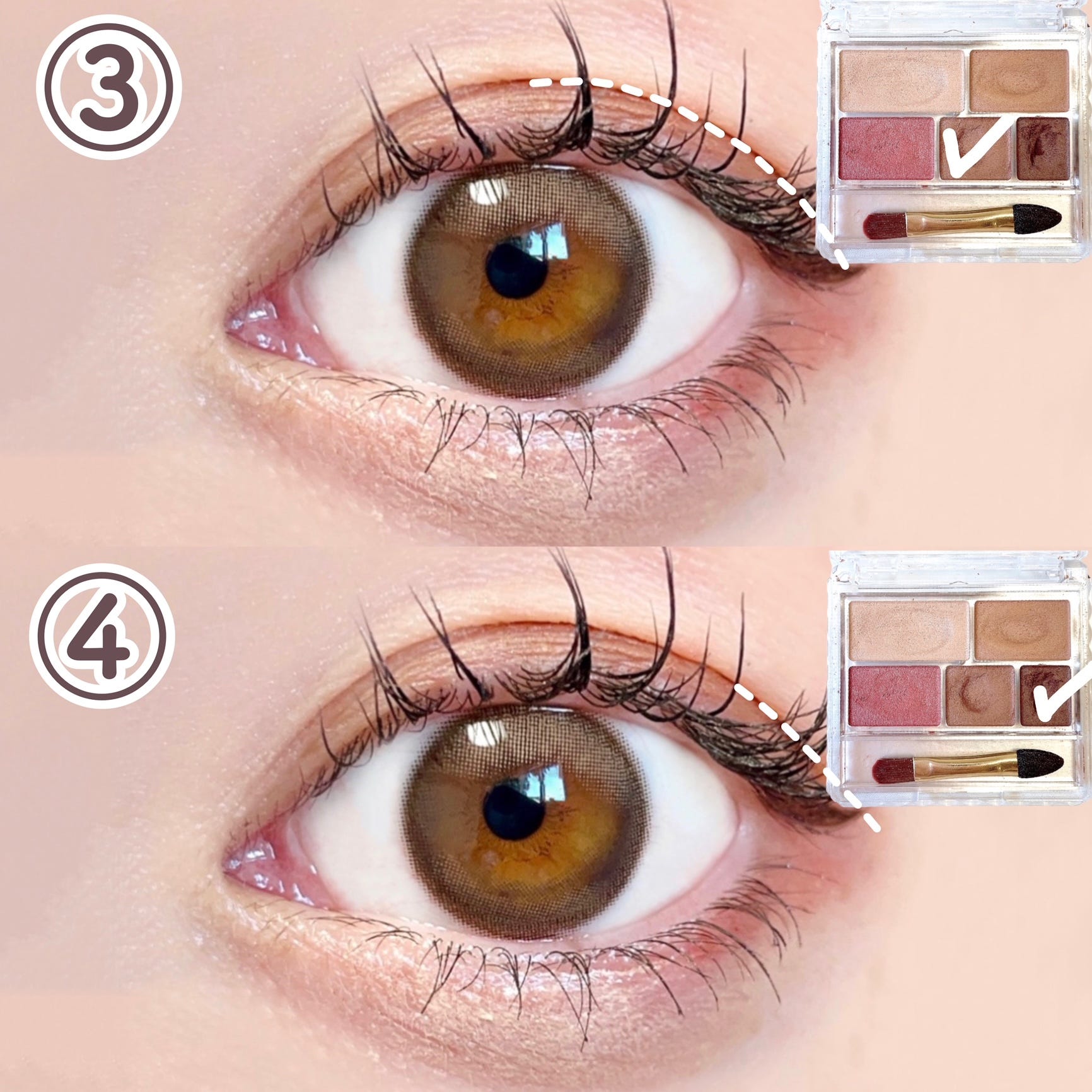 ③ 下の段の真ん中の茶色を黒目の上から目尻に塗ります。